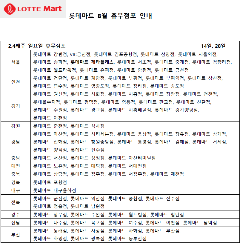 8월 롯데마트 휴무일 - 2,4째주 일요일