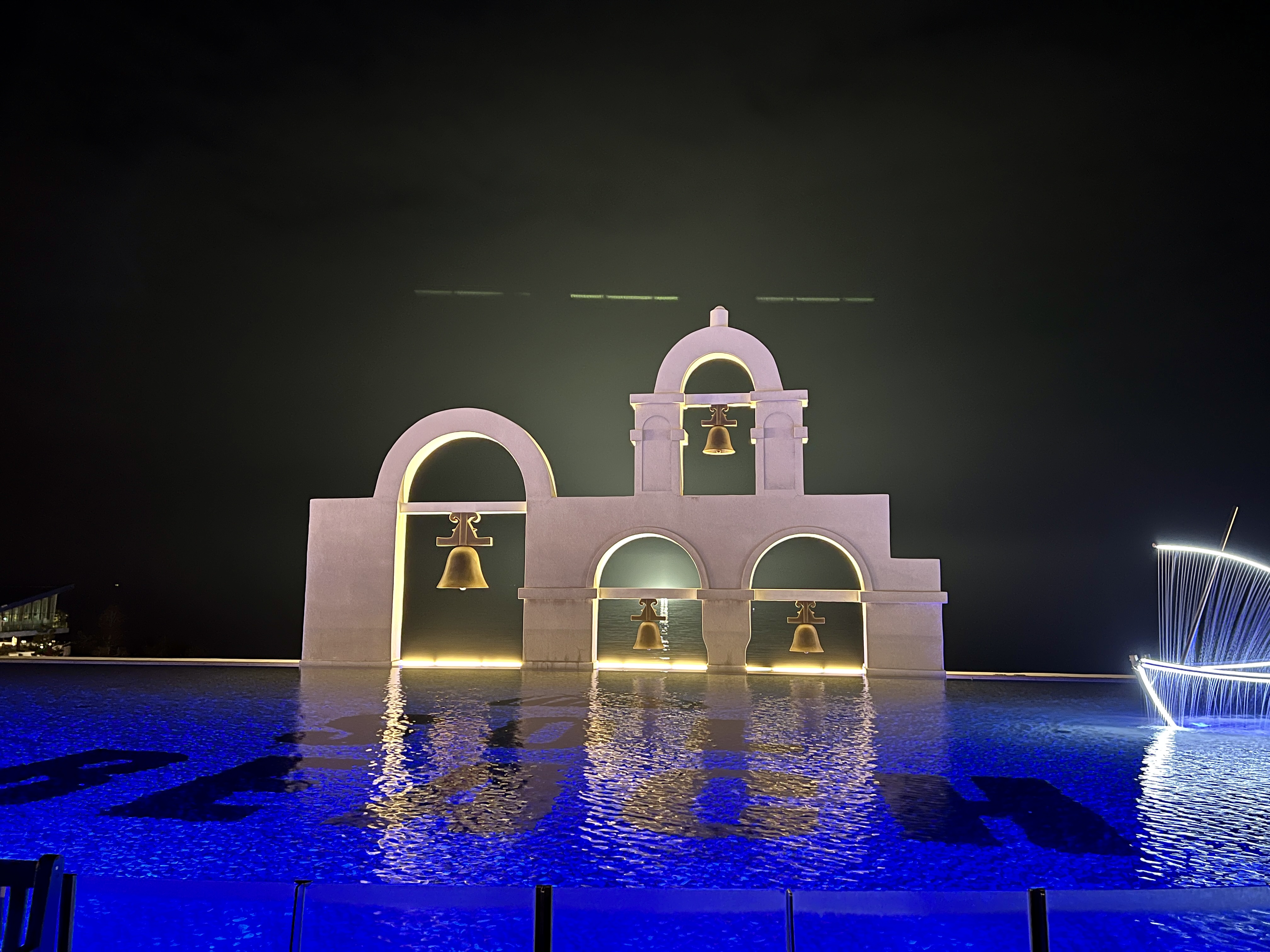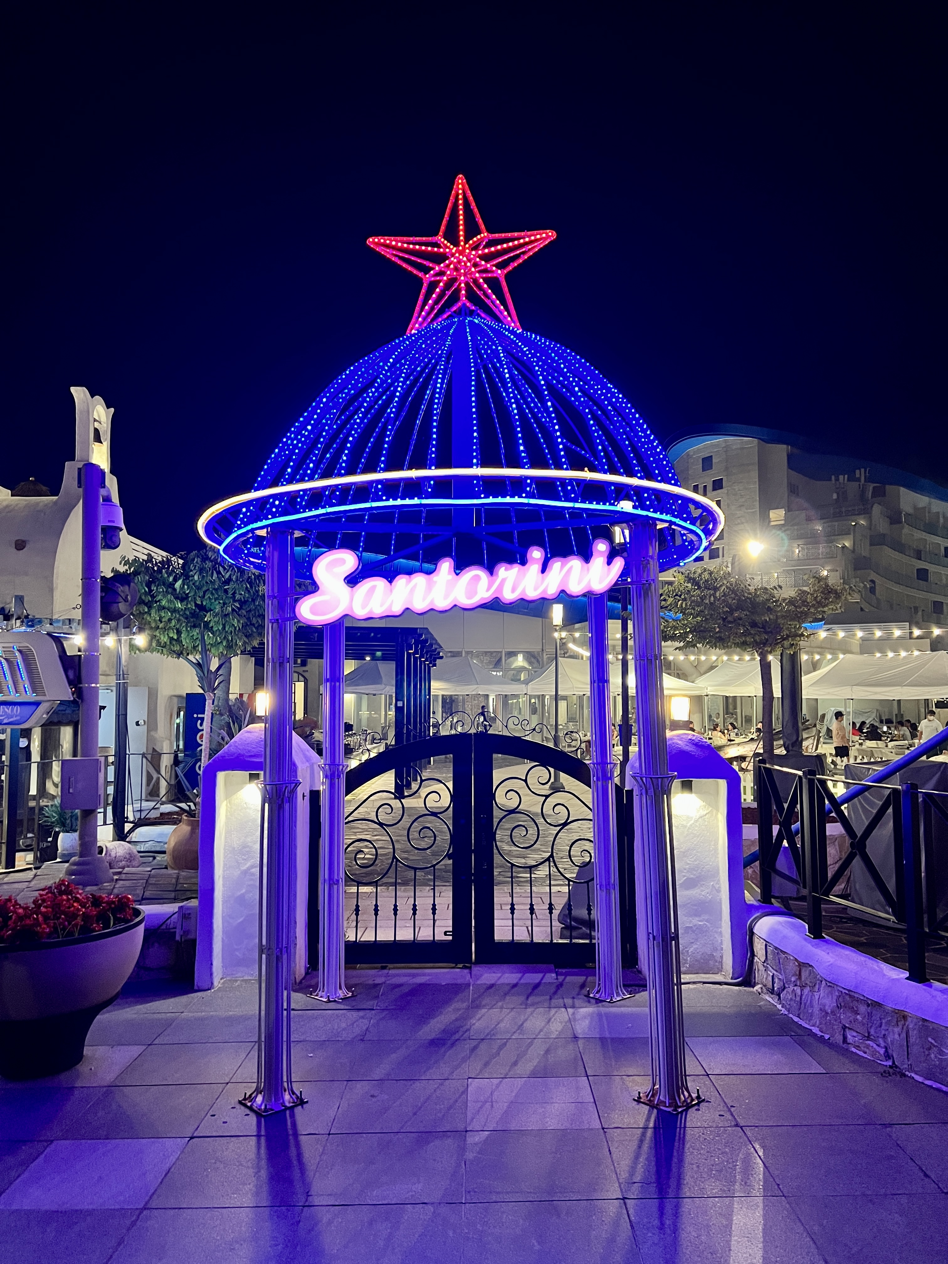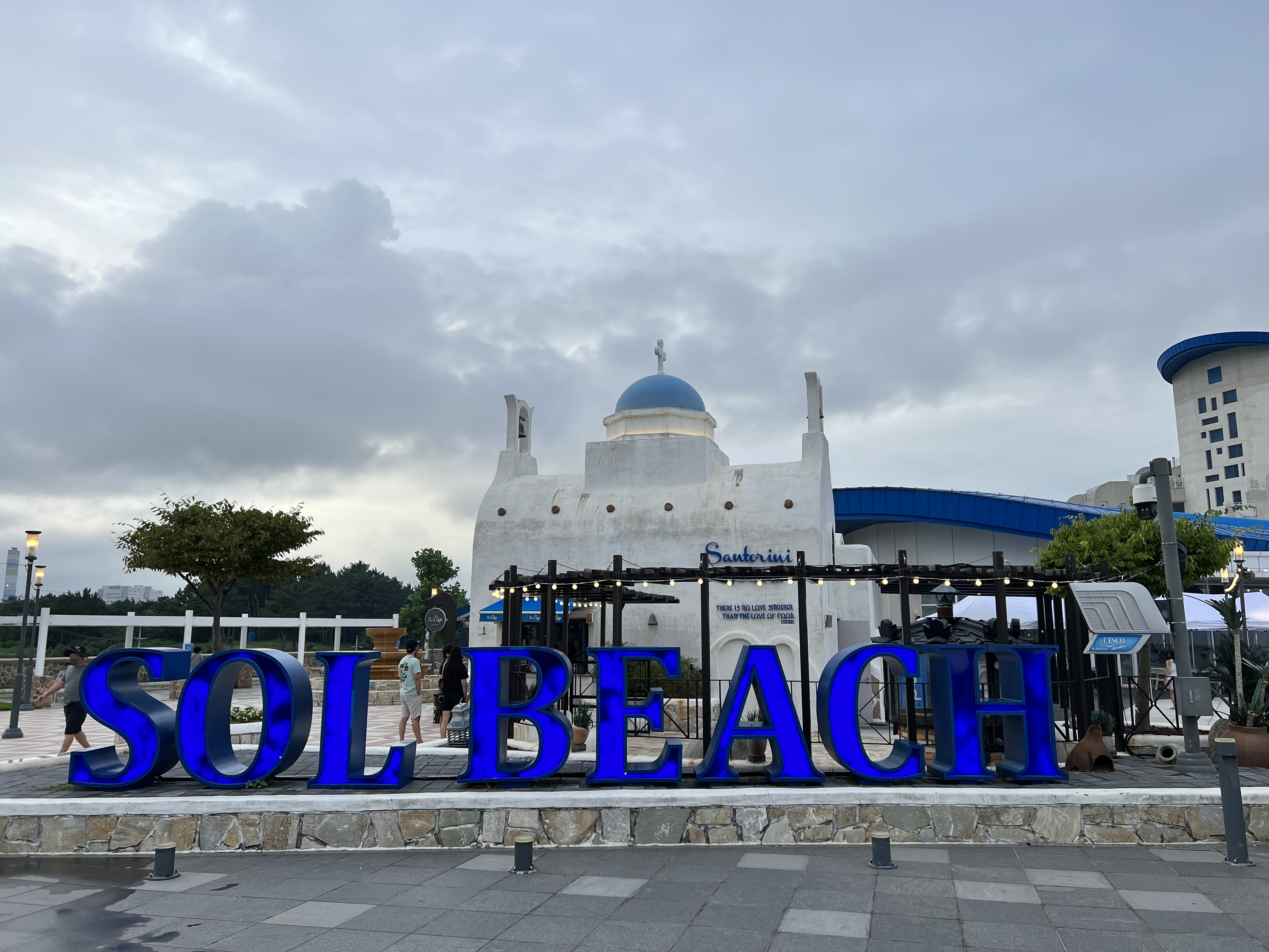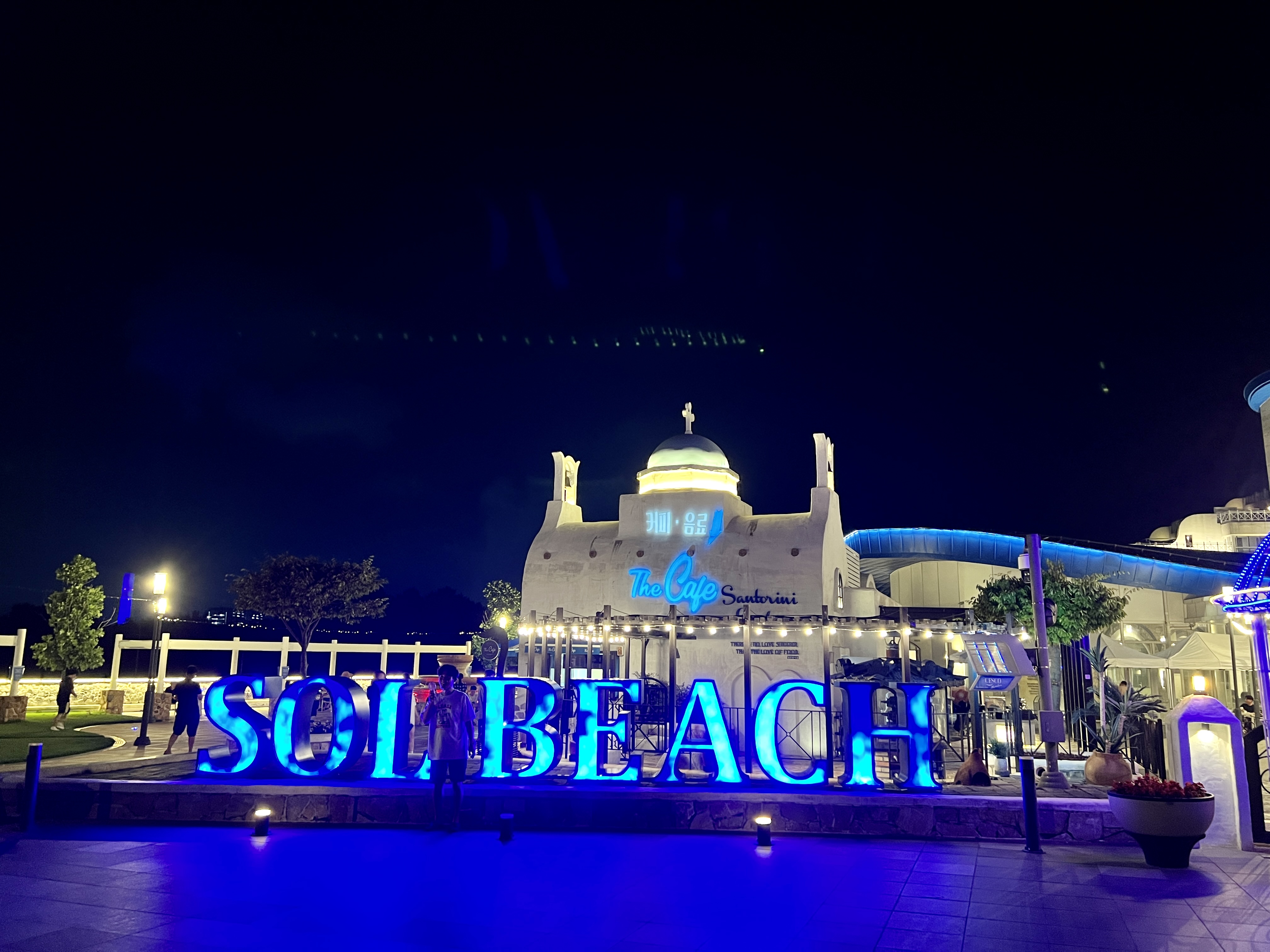 희망의 꽃 조형물과 SOL BEACH 마크 그리고 Santorini 영문글자는 밤에 조명이 들어오기 때문에