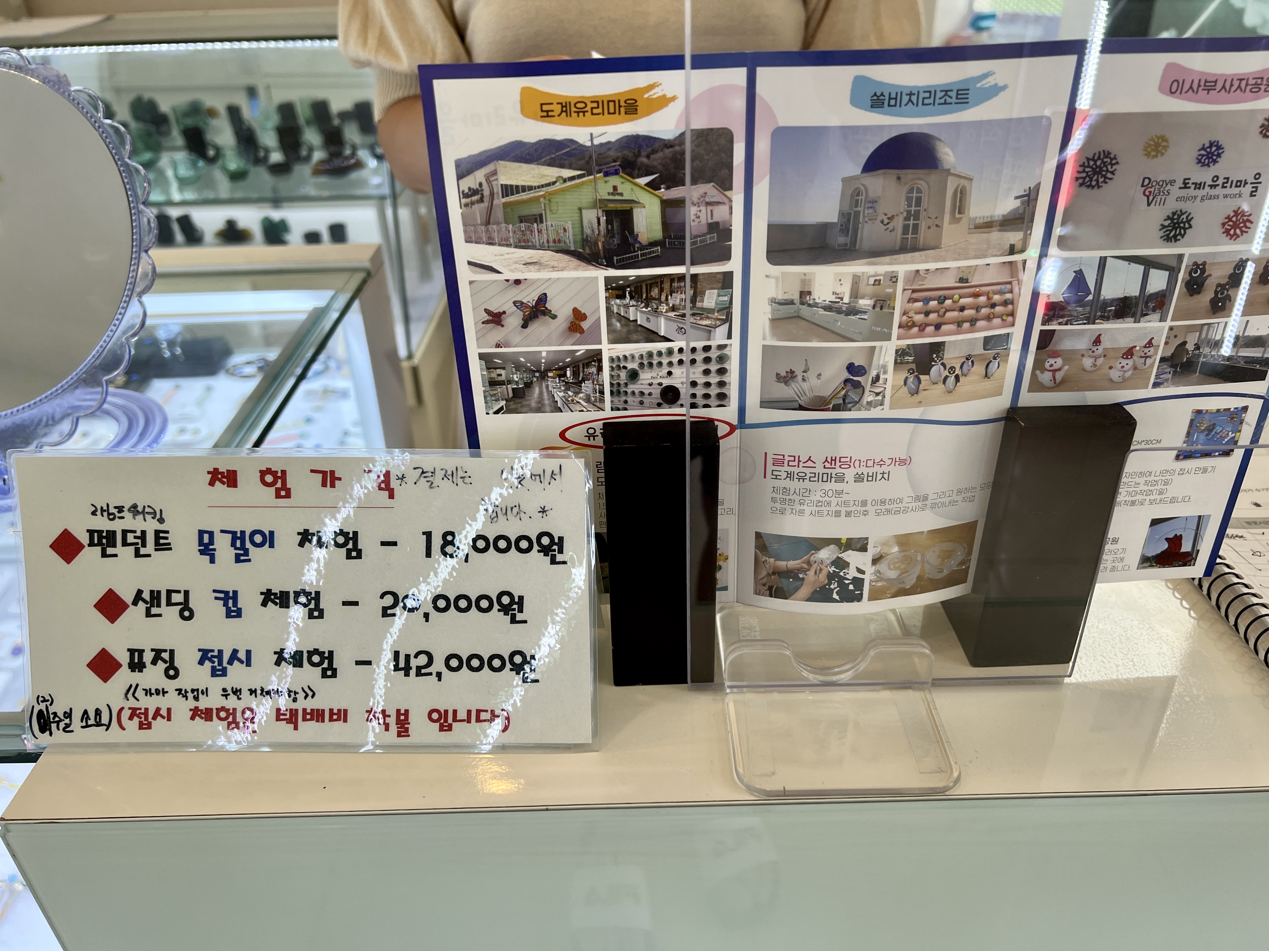 그리고 유리공예 체험도 가능한데, 유리공예 체험비용은 목걸이가 가장 저렴한 18,000원 이고