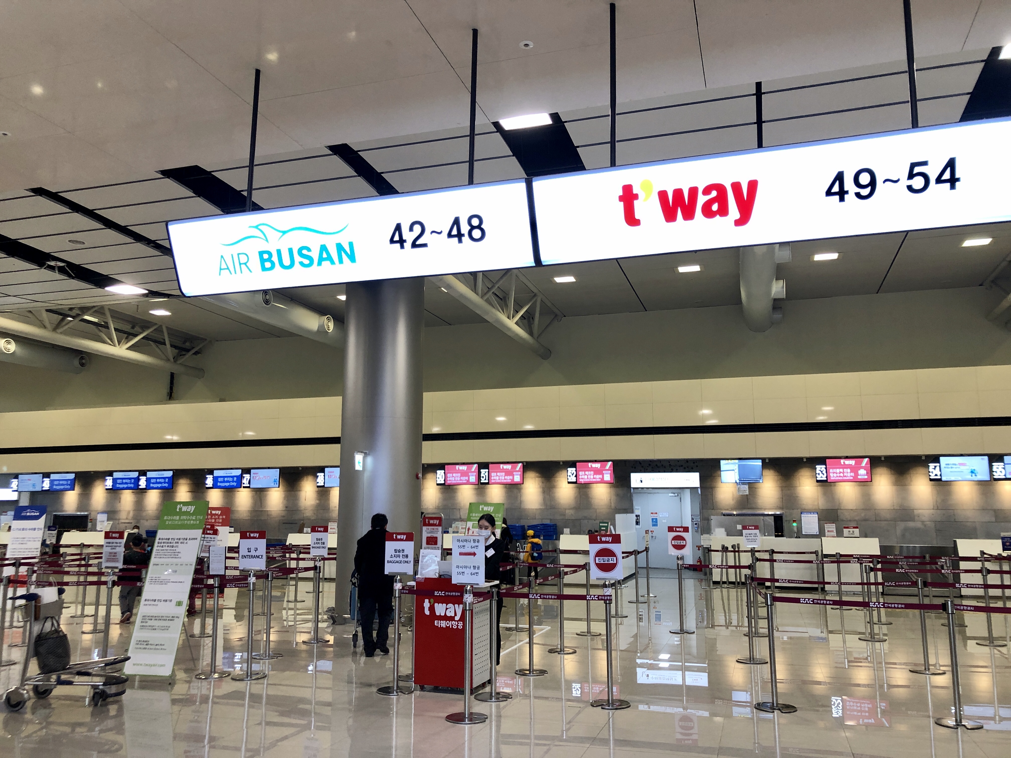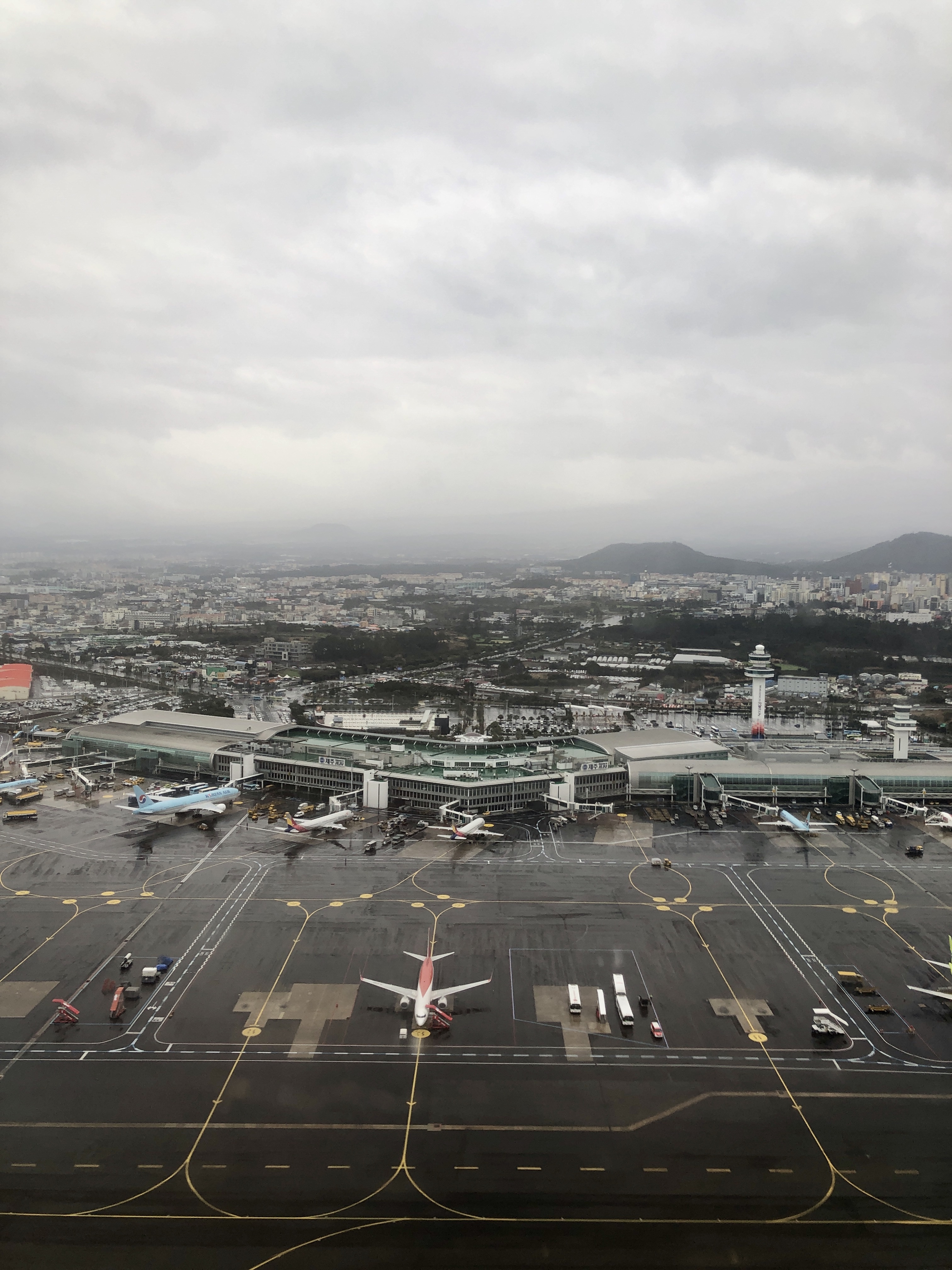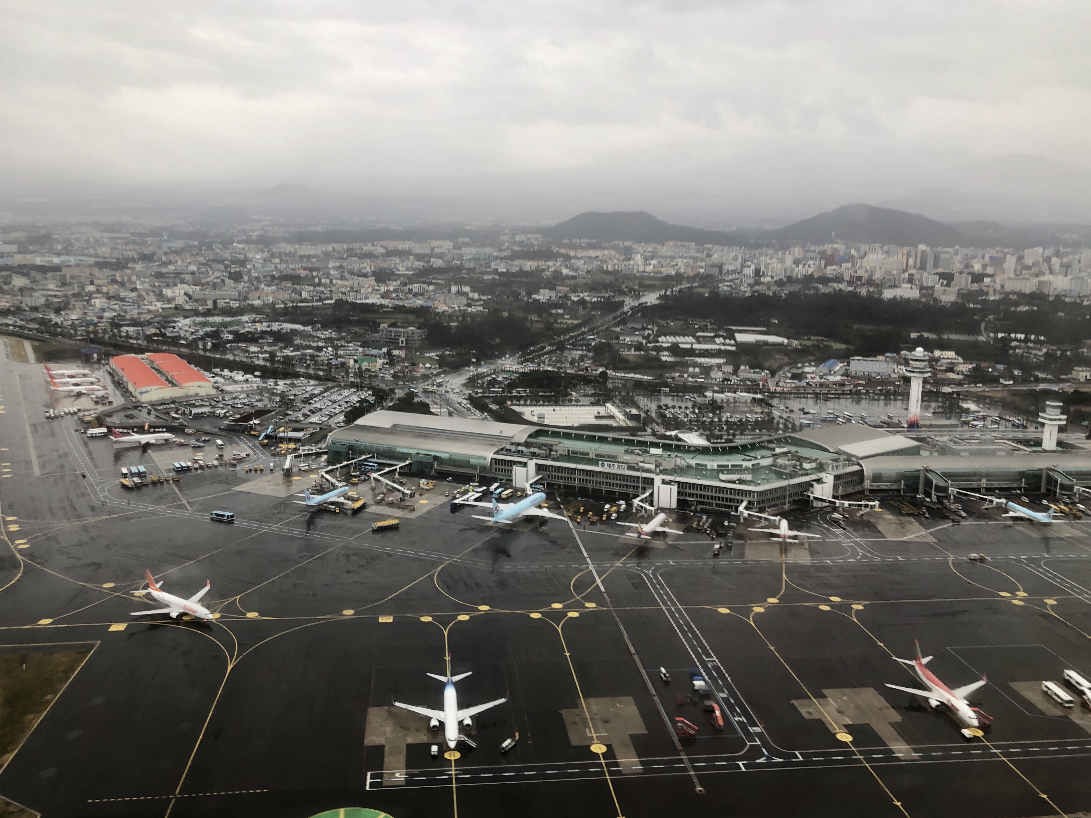 제주공항에서는 활주로까지 버스를 탑승하여 이동한 뒤, 계단을 올라 비행기에 탑승했다.