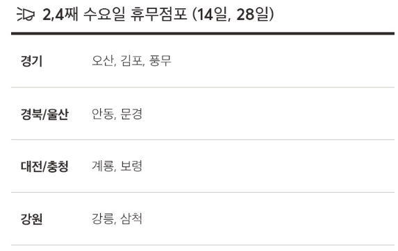 두번째로 2,4째주 수요일인 9월 14일과 9월 28일에도 9개의 홈플러스점포가 휴무하게 됩니다.