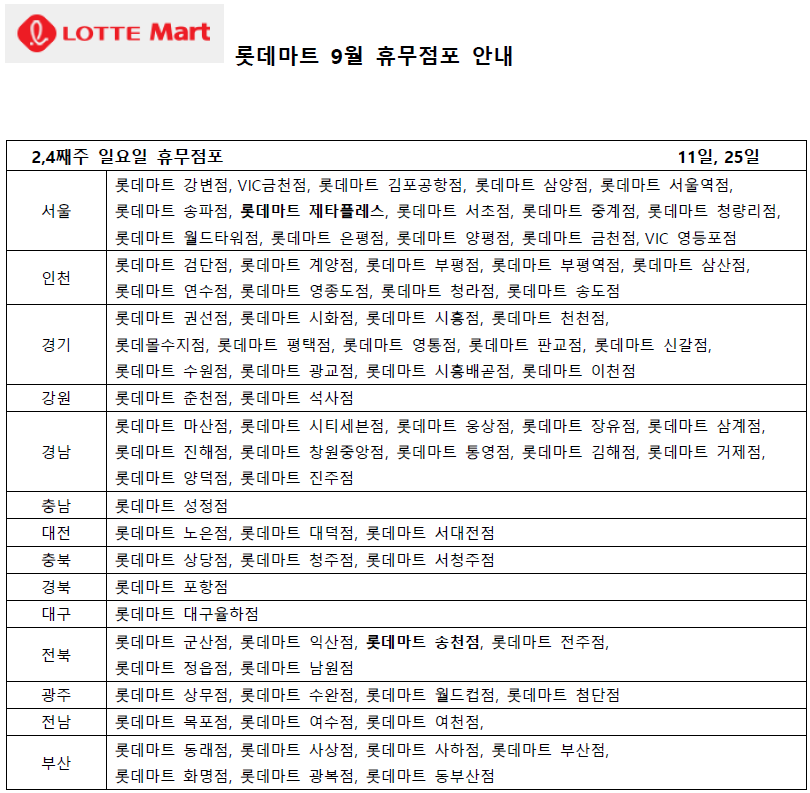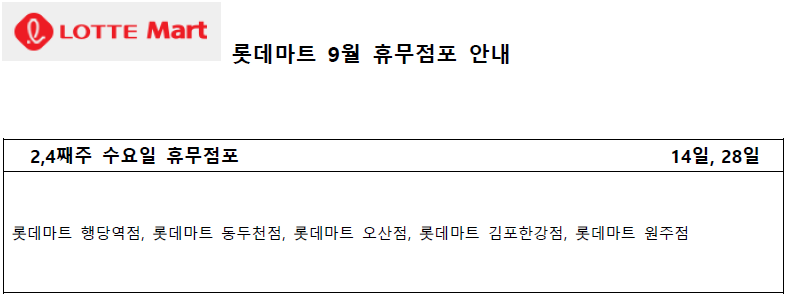 9월 롯데마트 휴무일 - 2,4째주 수요일