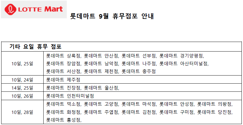 9월 및 추석연휴 롯데마트 휴무일 & 휴무점포
