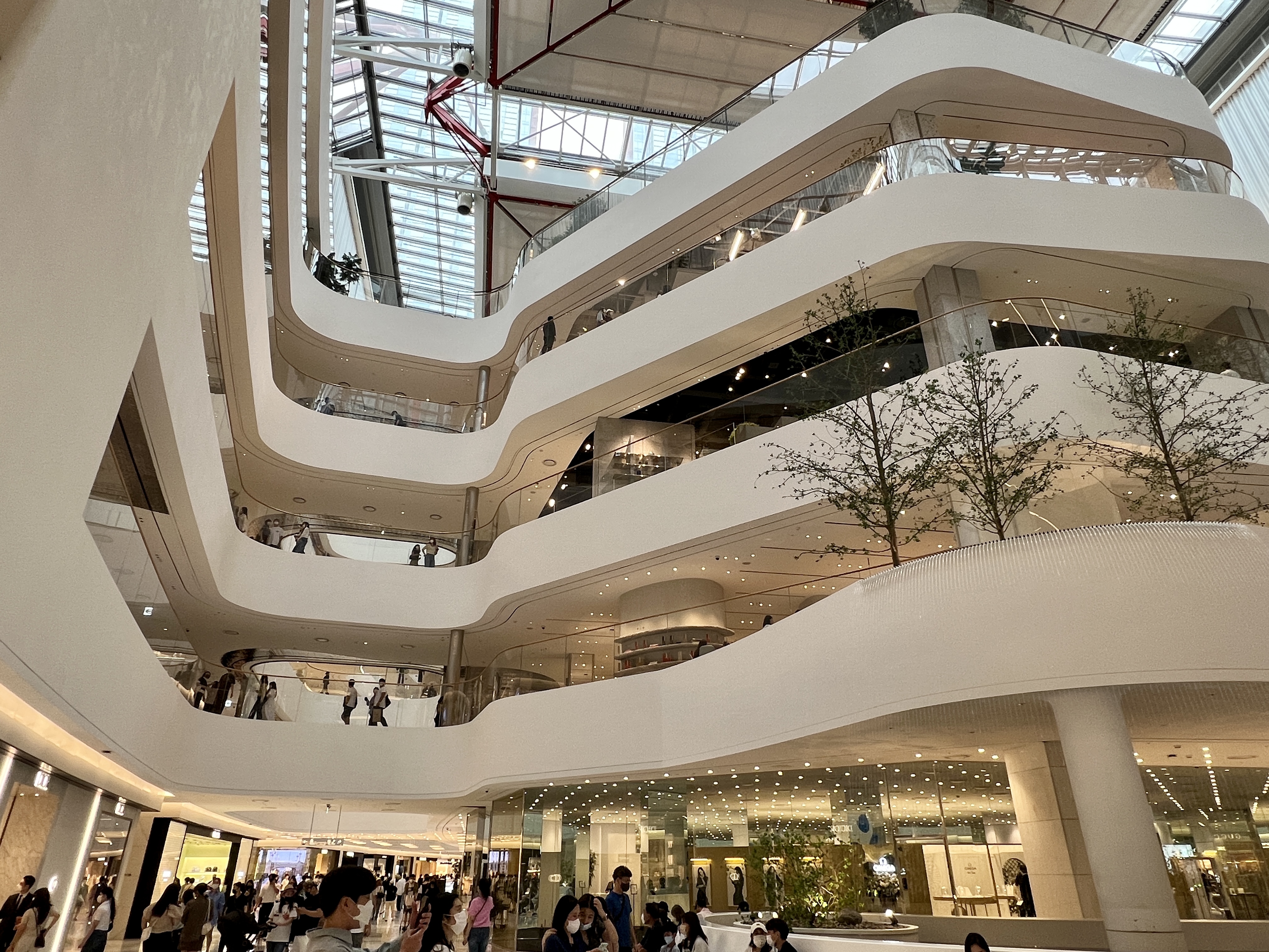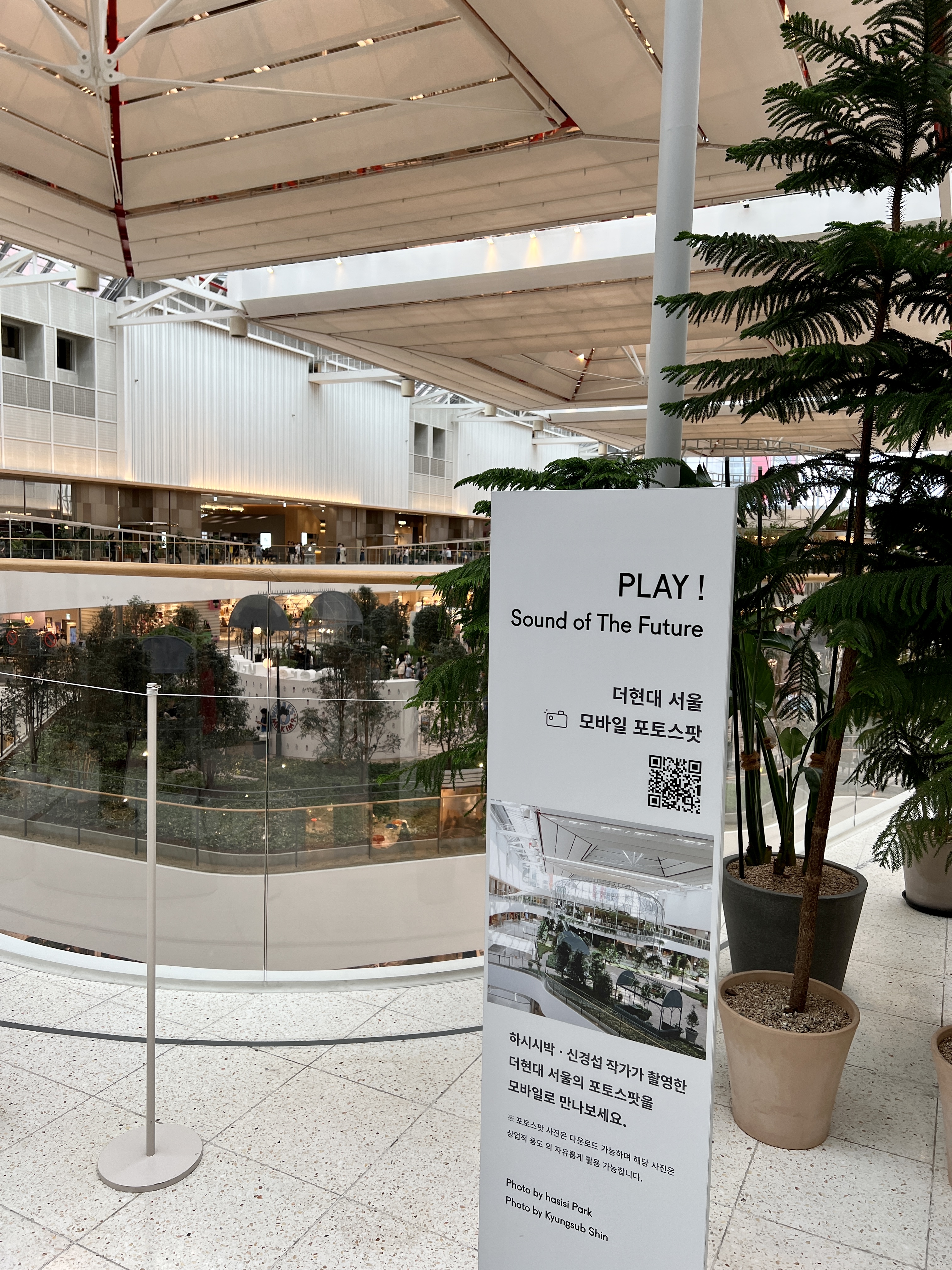 많은 방문자들이 여기서 더현대 서울 정원을 배경으로 추억을 남기고 있었습니다.