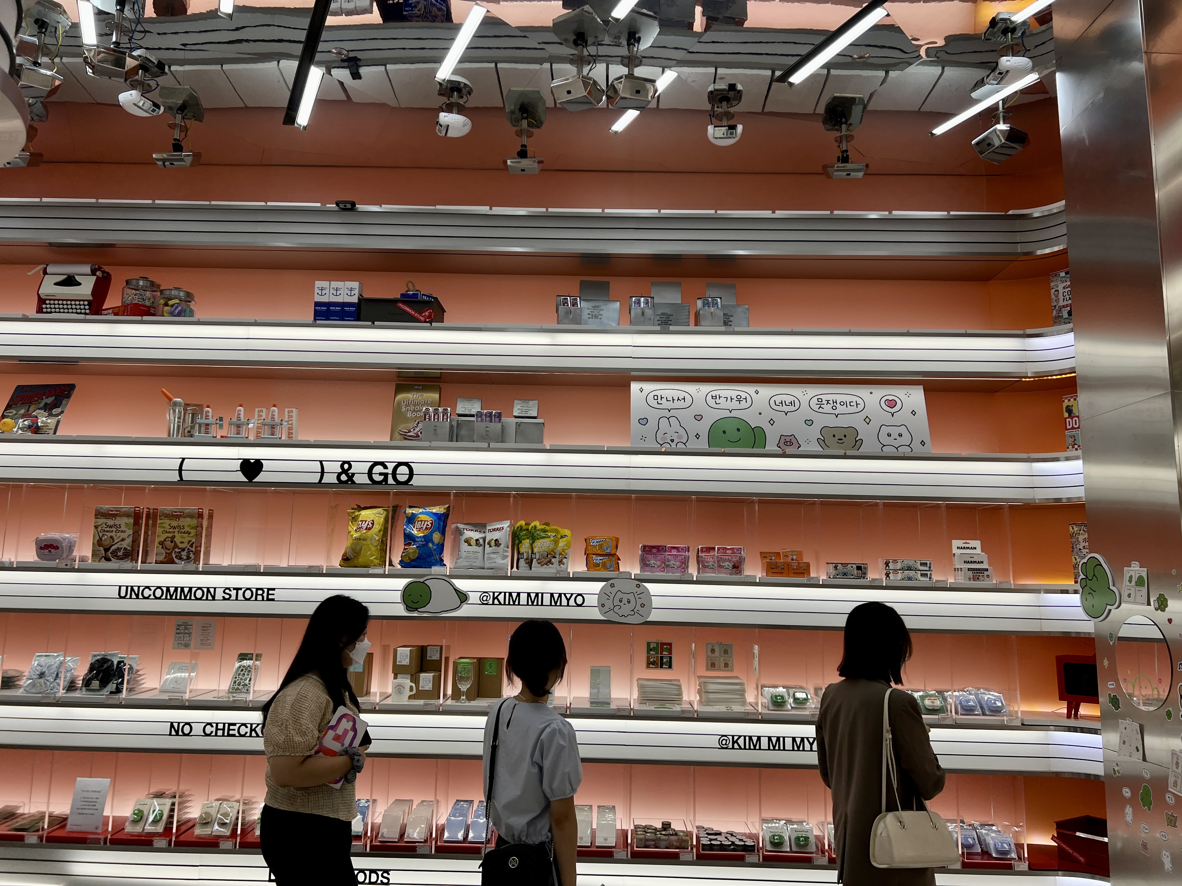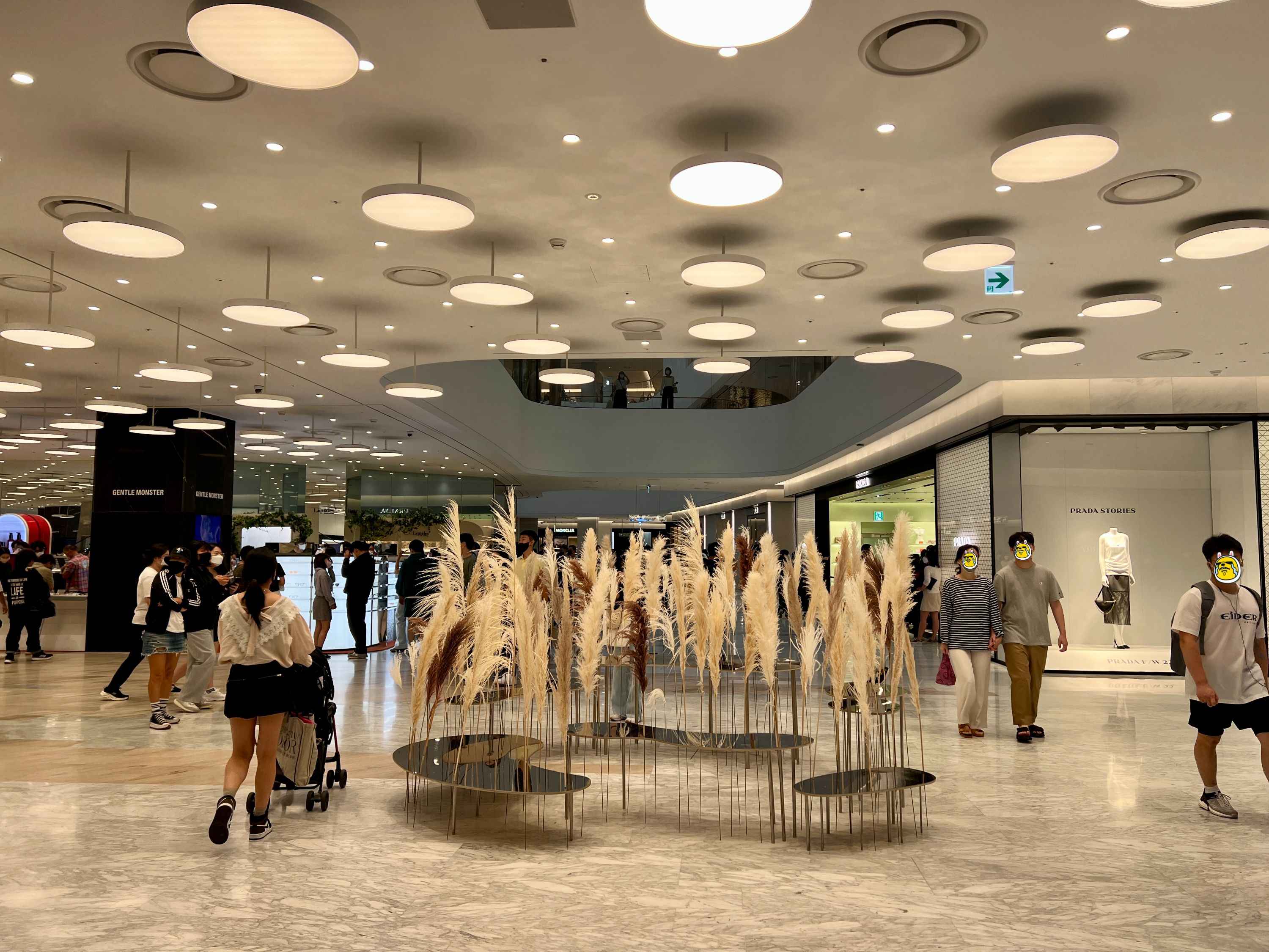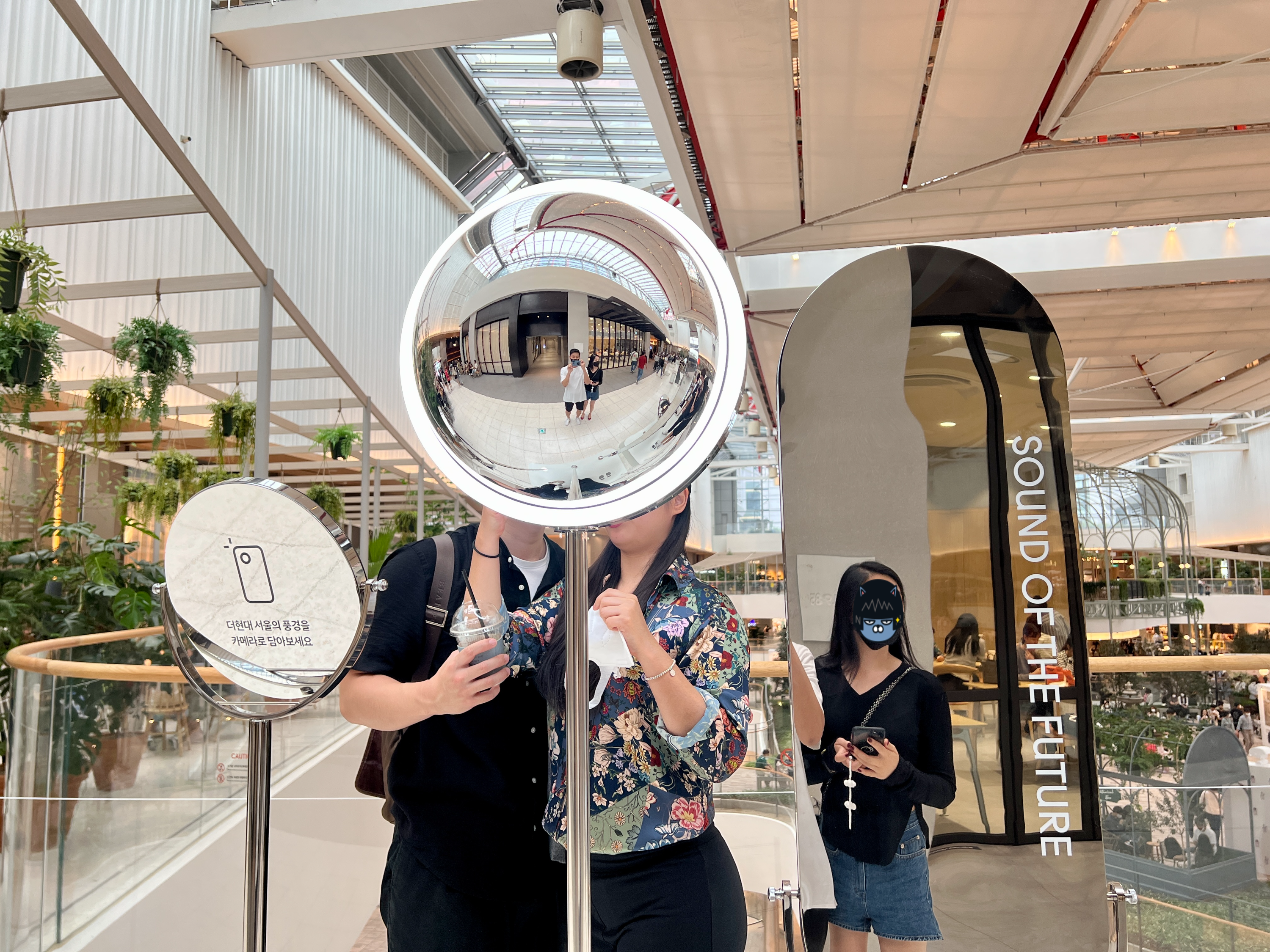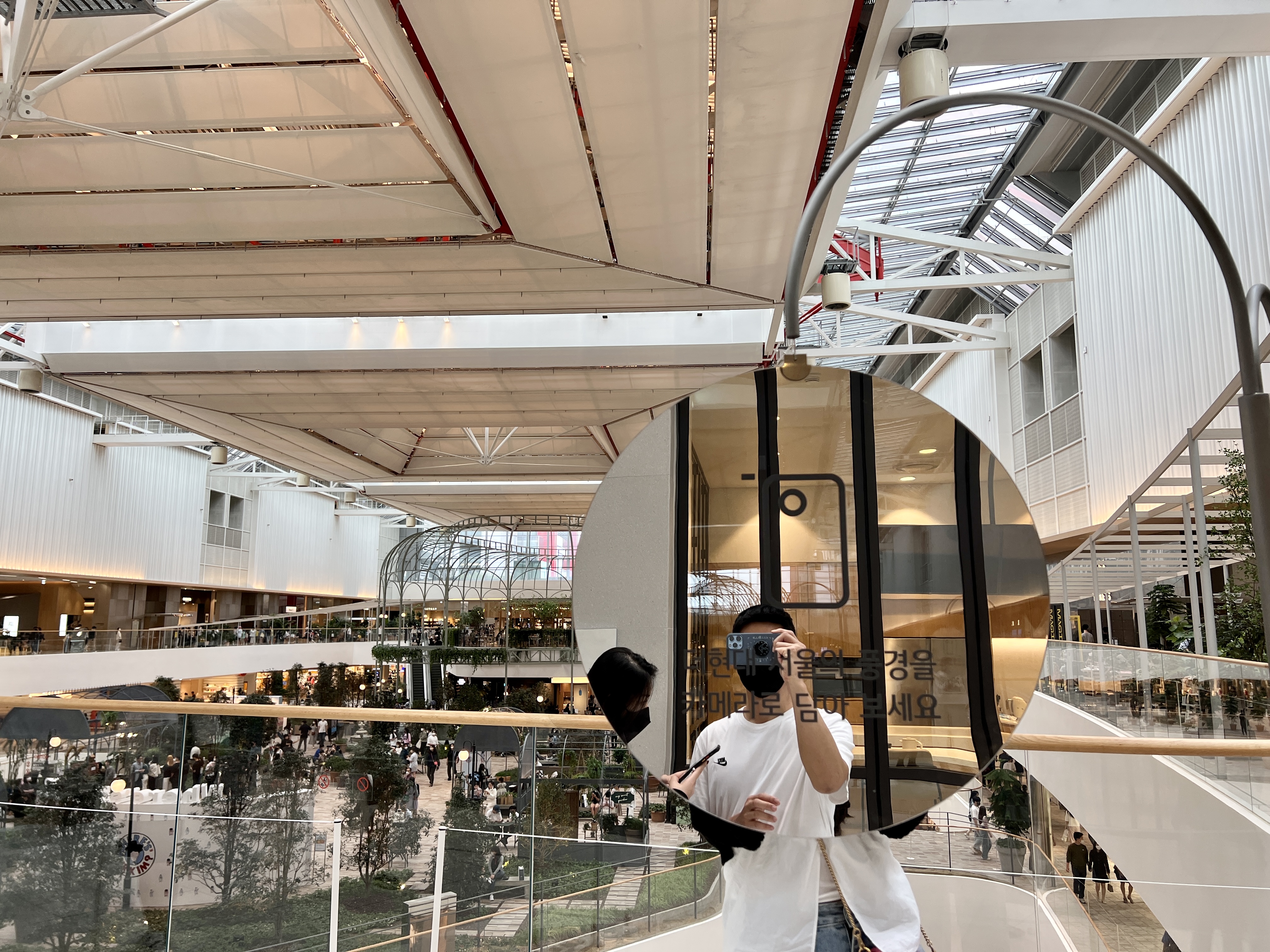 더현대 서울 5층에는 더현대 서울의 풍경과 함께 셀카를 찍을 수 있도록 거울이 배치되어 있습니다.