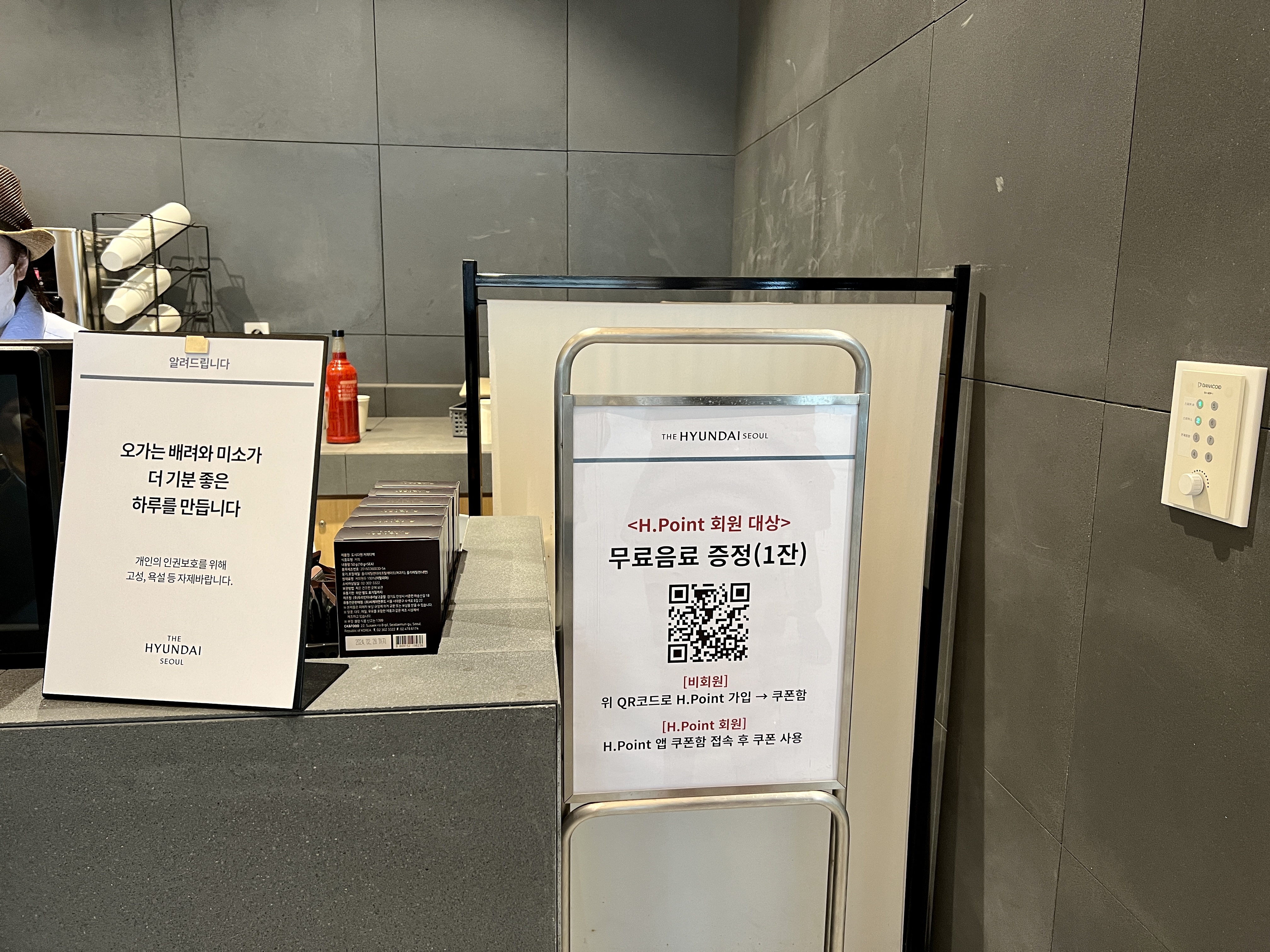 더현대 서울에서는 H 포인트 회원 대산 무료음료 1잔을 증정받을 수 있었는데요!