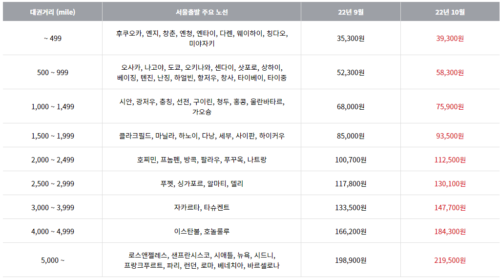 2022년 10월 1일부터(발권일 기준) 대한항공에 적용되는 국제선 유류할증료는 위와 같습니다.