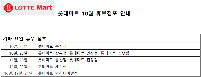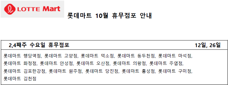 10월 롯데마트 휴무일 - 2,4째주 수요일