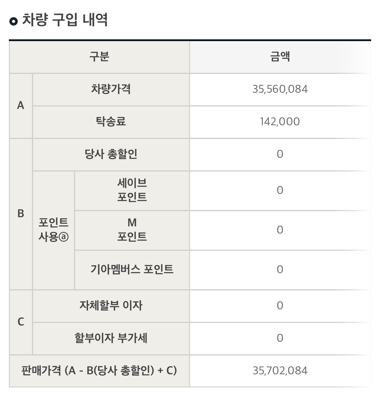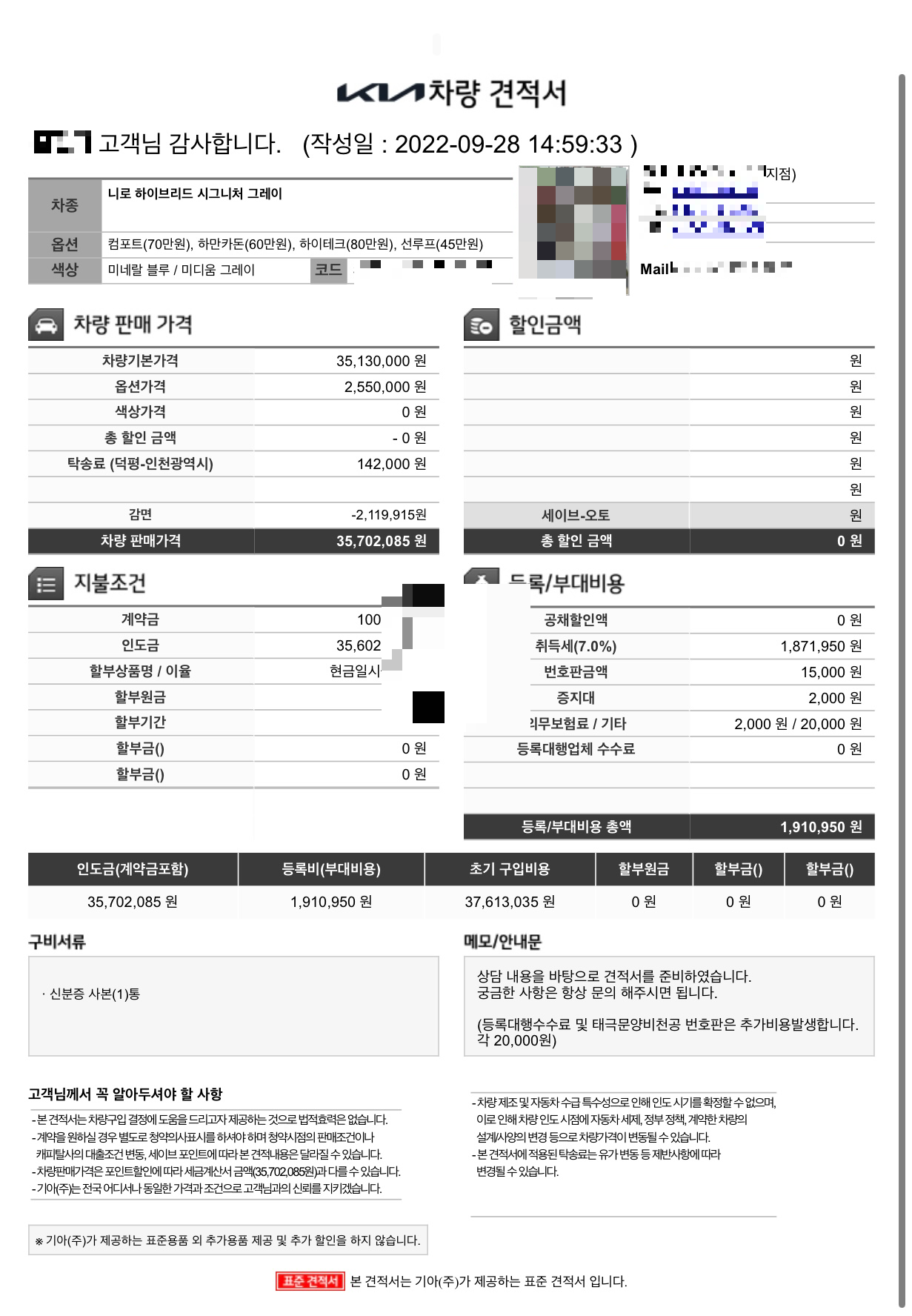 결국 니로 하이브리드 풀옵션 차량 구입가격은 3,570만원을 지불하였습니다.