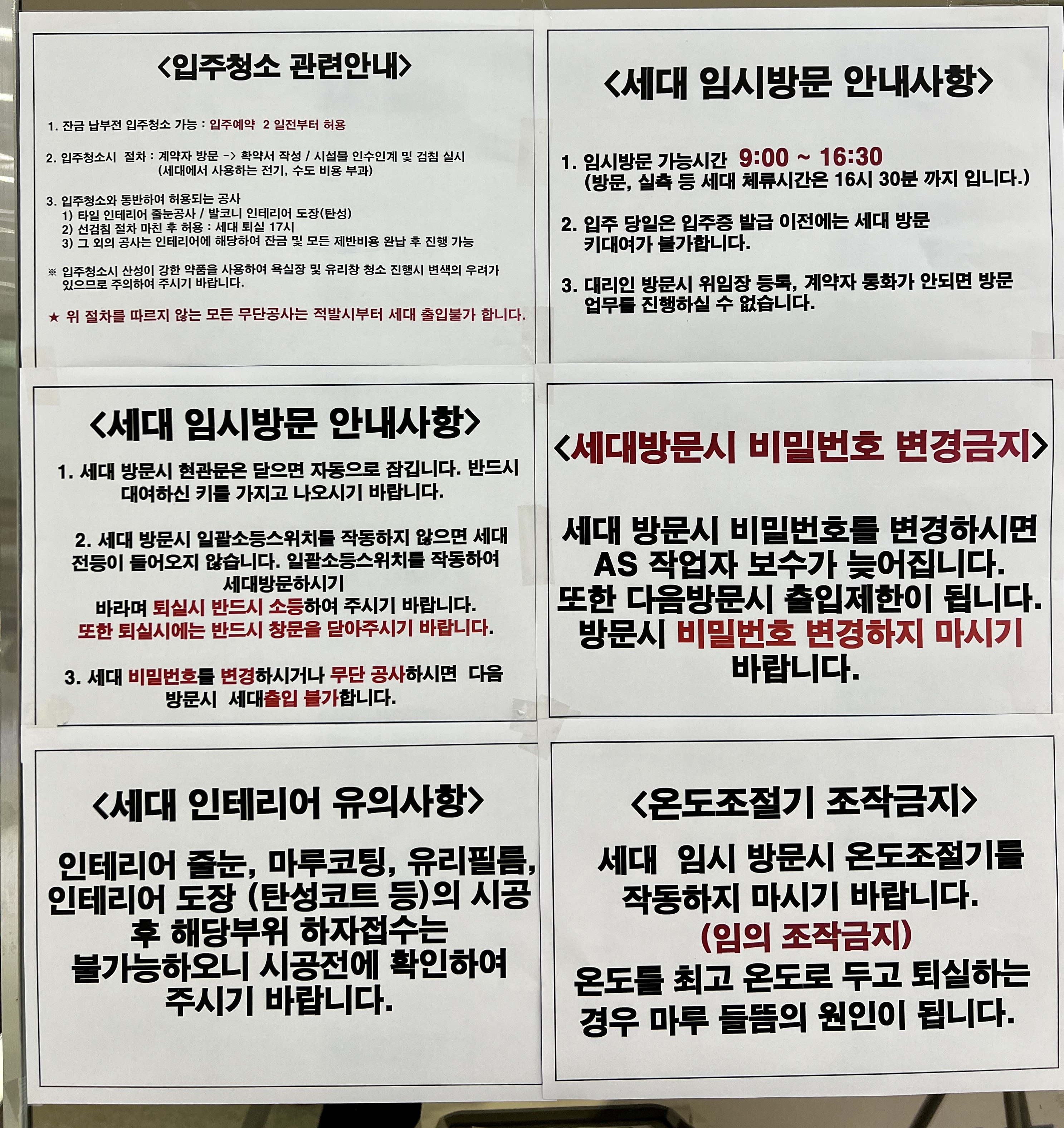 입주자 지원센터는 9시부터 16시 30분까지 운영되니, 그안에 사후점검 및 세대 방문을 마쳐야합니다.