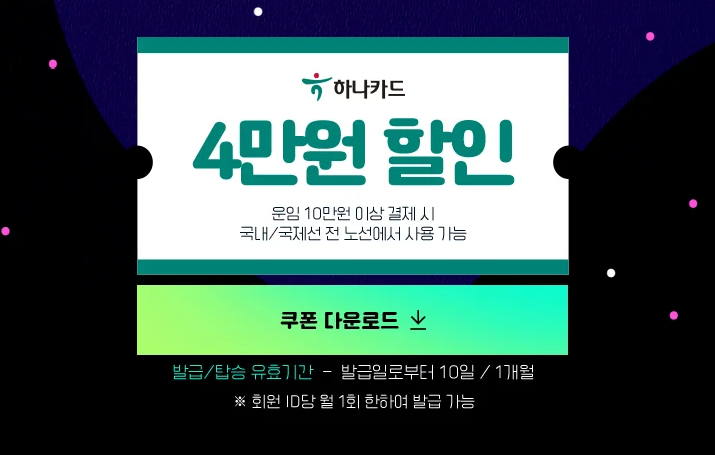 그럼 그 선착순 쿠폰을 받아서 하나카드로 결제하면 4만원 할인을 받게되는것인데요!