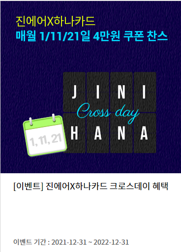 이벤트입니다. 그럼 진에어X하나카드 크로스데이 혜택에 대해 자세히 알아보겠습니다.