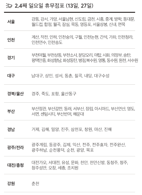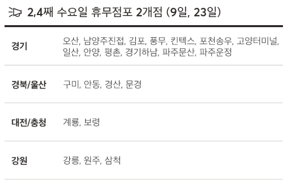 • 11월 14일, 11월 28일 휴무 - 영주 홈플러스, 논산 홈플러스