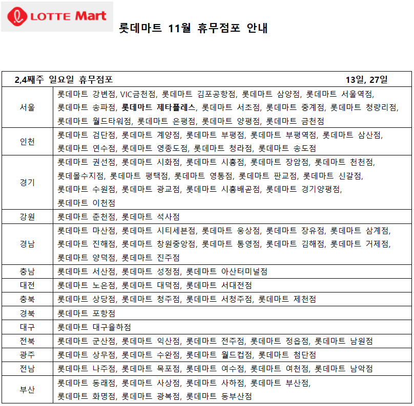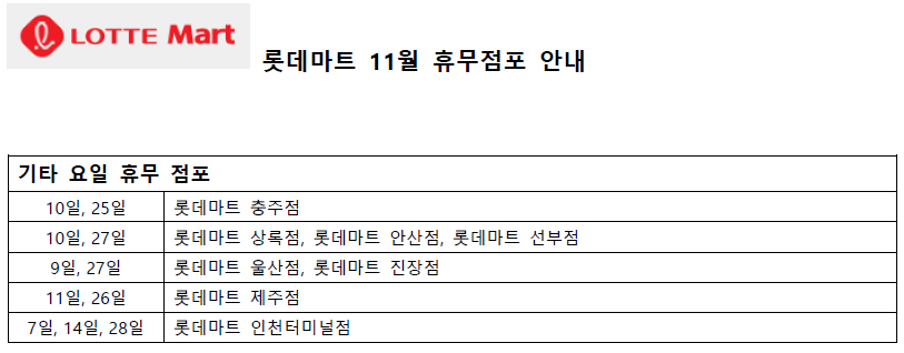 11월 롯데마트 휴무일 - 2,4째주 수요일