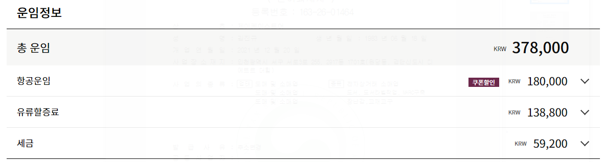 항공운임에 쿠폰할인이라고 씌여진 부분이 바로 하나카드 쿠폰할인 내역입니다 ^^