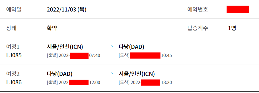 LJ085 다낭-인천 (DAD-ICN) 12:00 출발 - 18:20 도착
