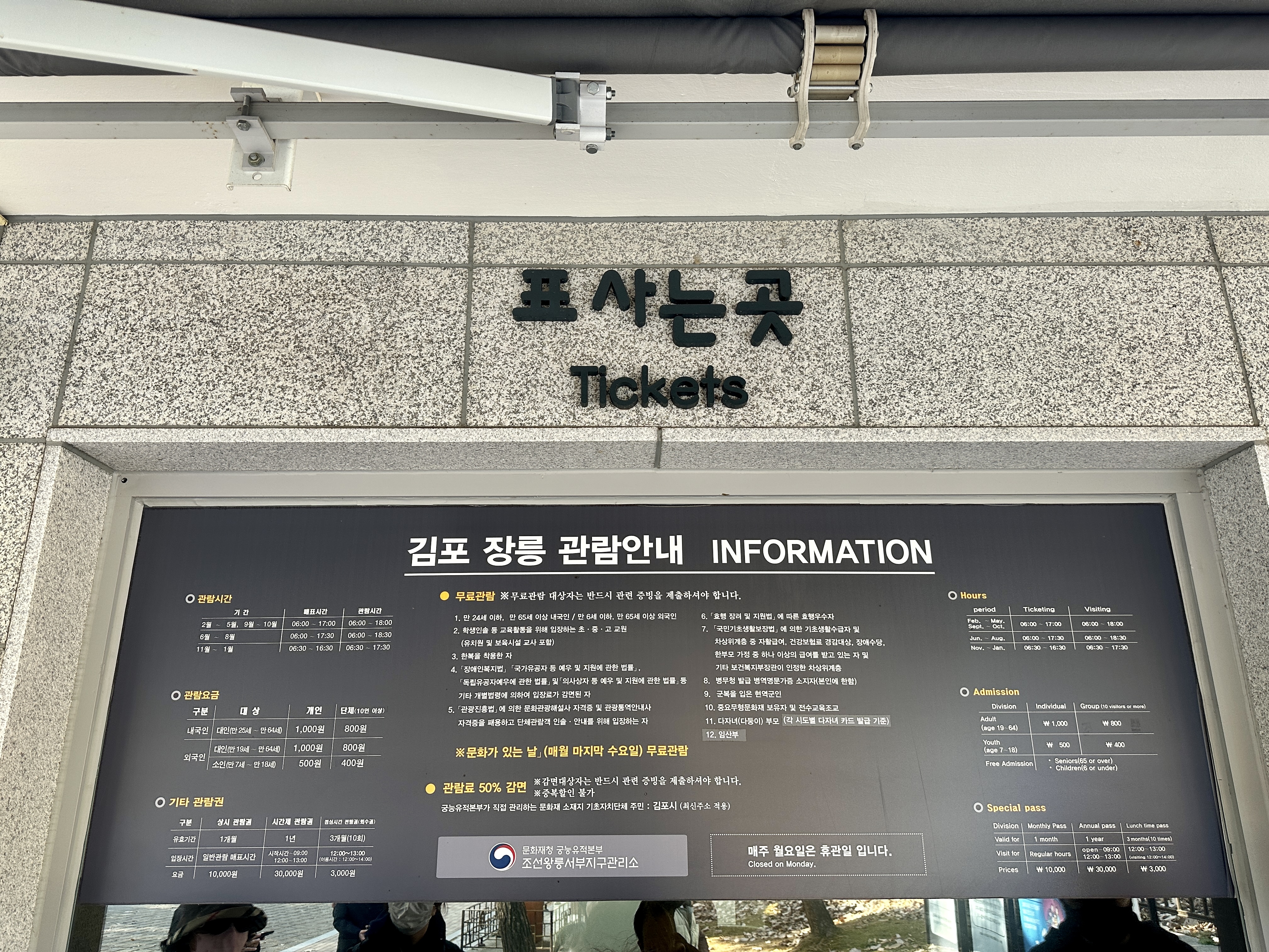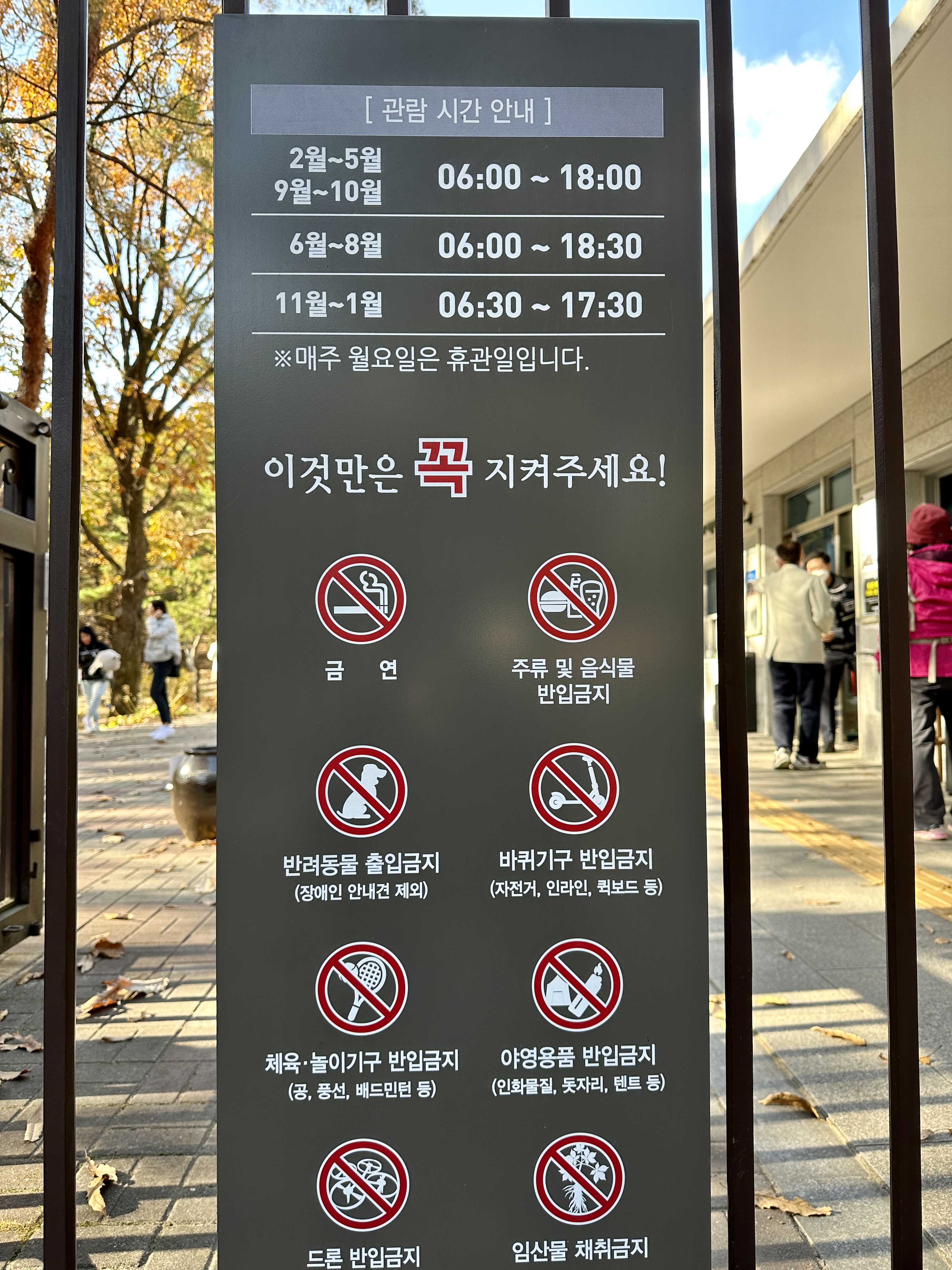 김포 장릉은 월요일마다 휴관일이고 오전 6시부터 (11~1월은 6시 30분부터) 18시경까지 관람가능합니다.