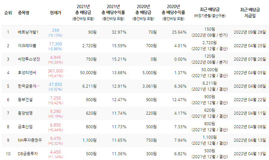 1위는 베트나개발1 로 현재가 259원 대비 2021년 배당금이 90원 이었으니,