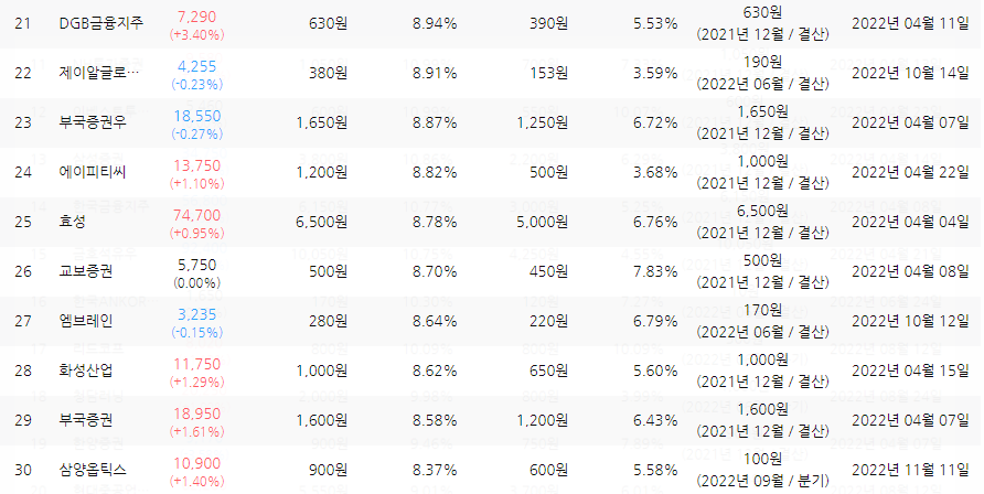 팍스넷 기준 시가배당률 높은 종목 21위부터 30위 까지는 위와 같고