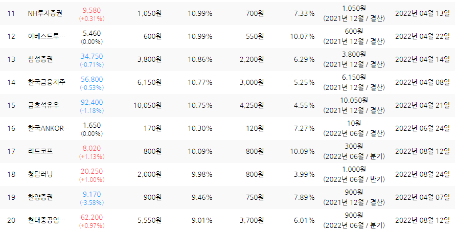 시가배당률 높은 종목 11위~20위도 금융주가 많이 포진되어 있습니다.
