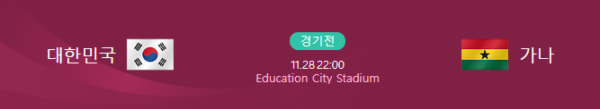 대한민국 가나 경기일정은 11월 28일 (월) 22시에 Education City stadium 에서 진행됩니다.