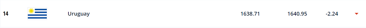 10월 6일 기준으로 피파에서 발표한 피파랭킹에 따르면 우루과이는 1638.71점으로 14위를 기록했습니다.