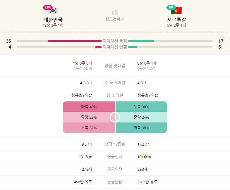 역시나 예상대로 포르투갈은 같은 H조에서 가장 높은 피파랭킹을 기록하고 있습니다.