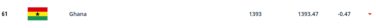 10월 6일 기준으로 피파에서 발표한 피파랭킹에 따르면 가나는 1393점으로 61위를 기록했습니다.