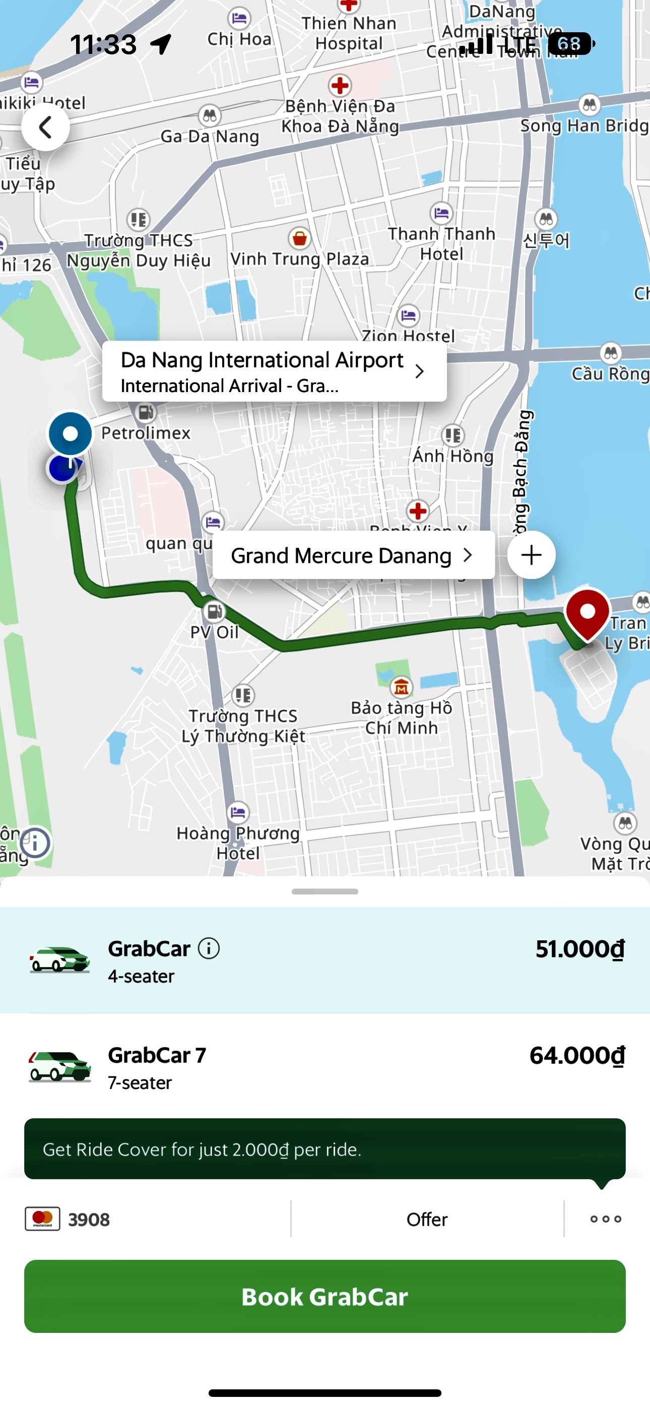 다낭 공항에서 시내까지는 4인승 차량을 이용하면 그랩 요금이 약 5만동 정도 나왔습니다.