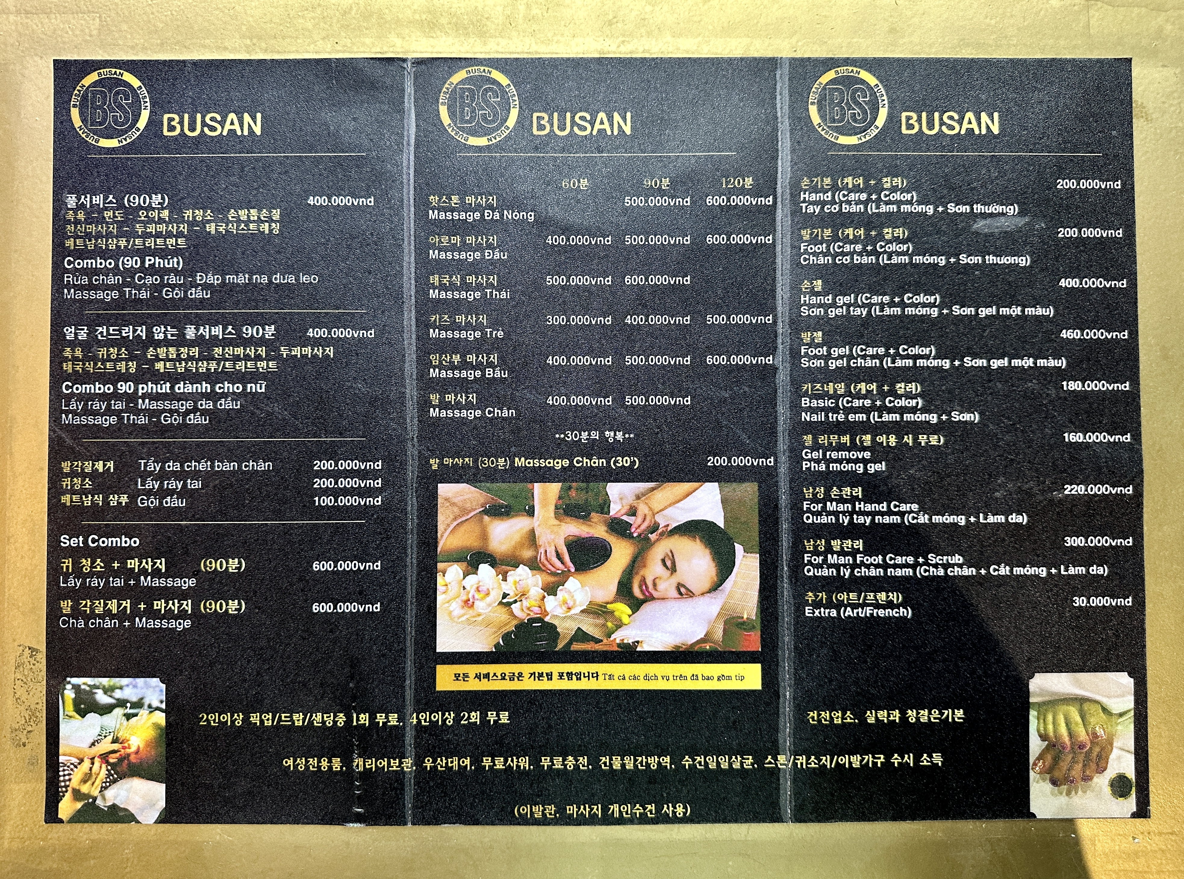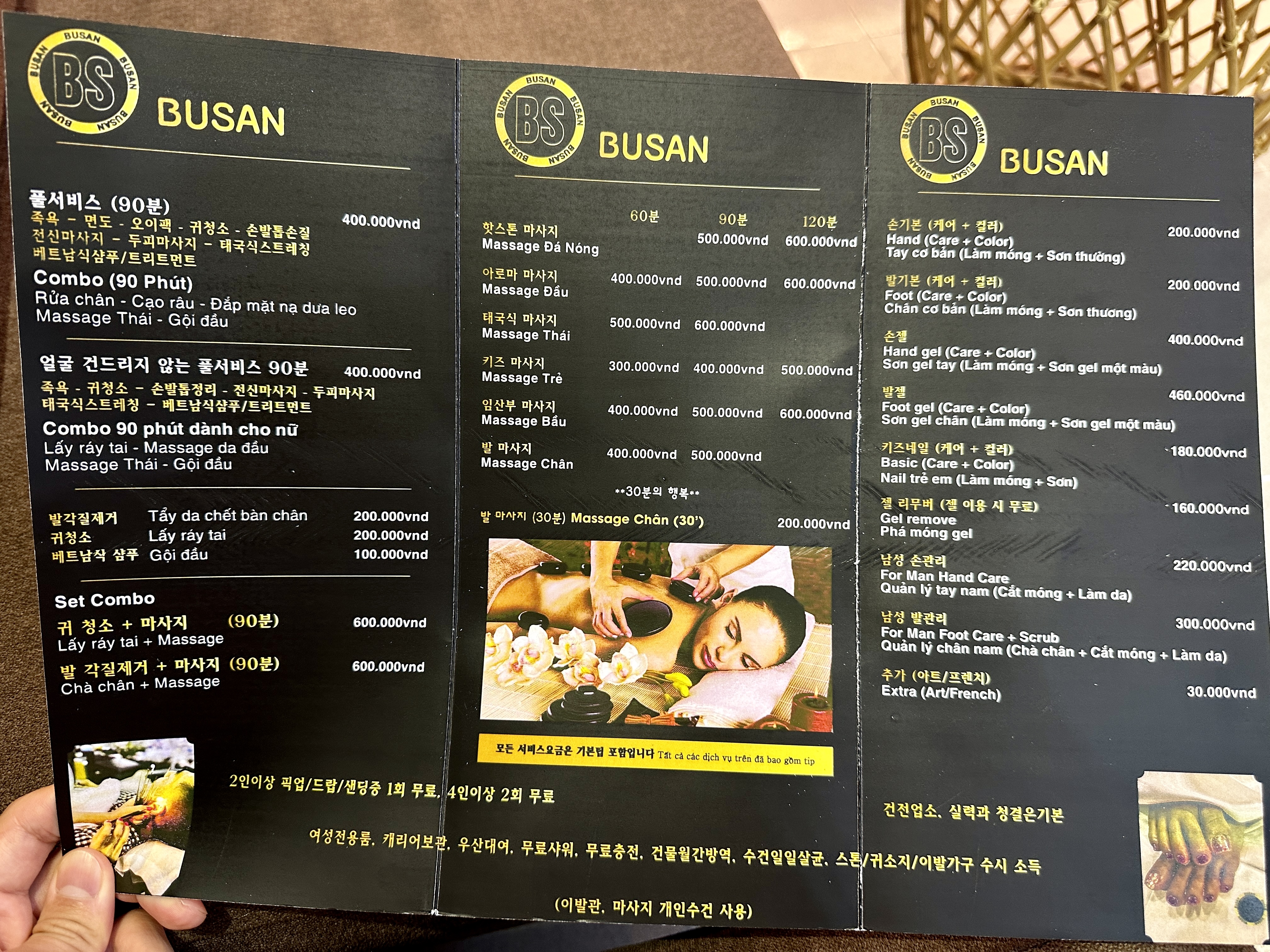족욕 - 면도 - 오이팩 - 귀청소 - 손발톱손질 - 전신마사지 - 두피마사지 - 태국식스트레칭 - 베트남식샴푸까지