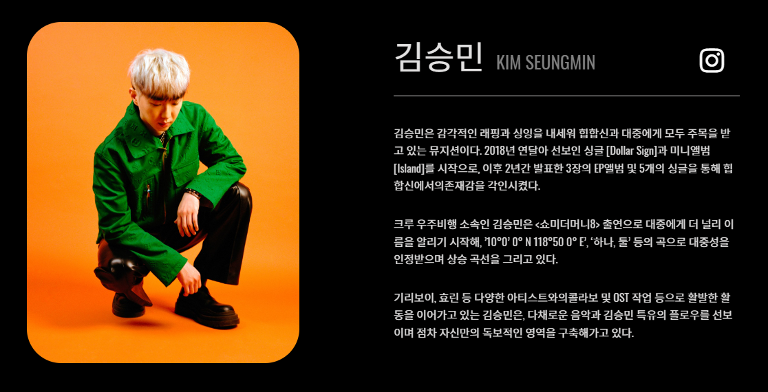 김승민은 감각적인 래핑과 싱잉을 내세워 힙합신과 대중에게 모두 주목을 받고 있는 뮤지션이다.