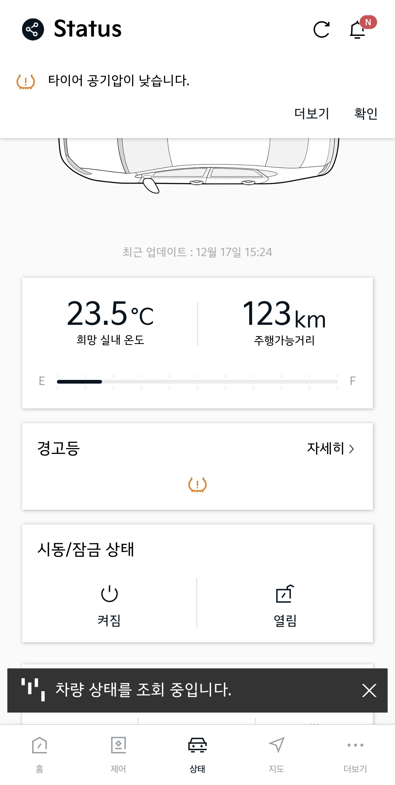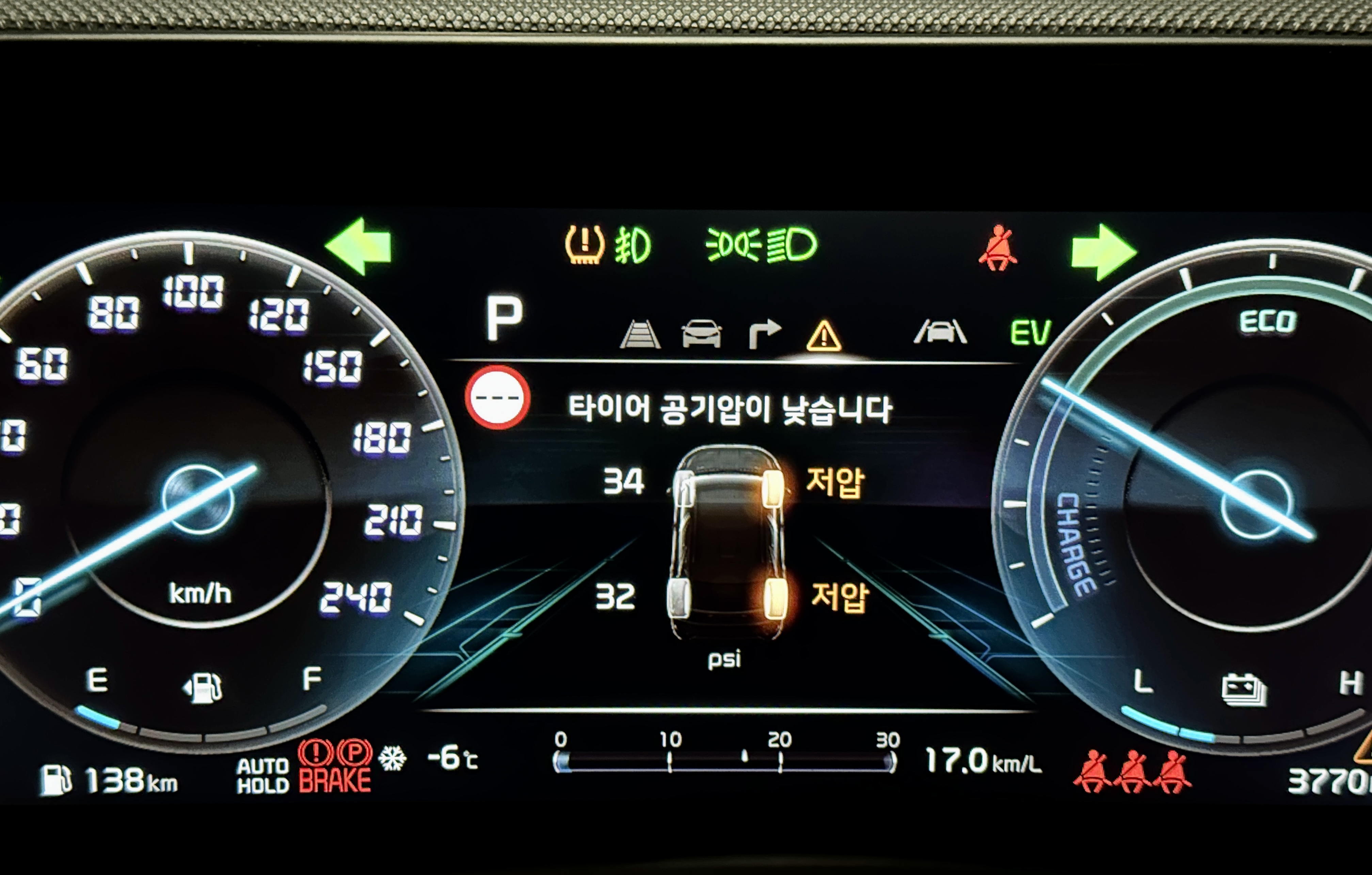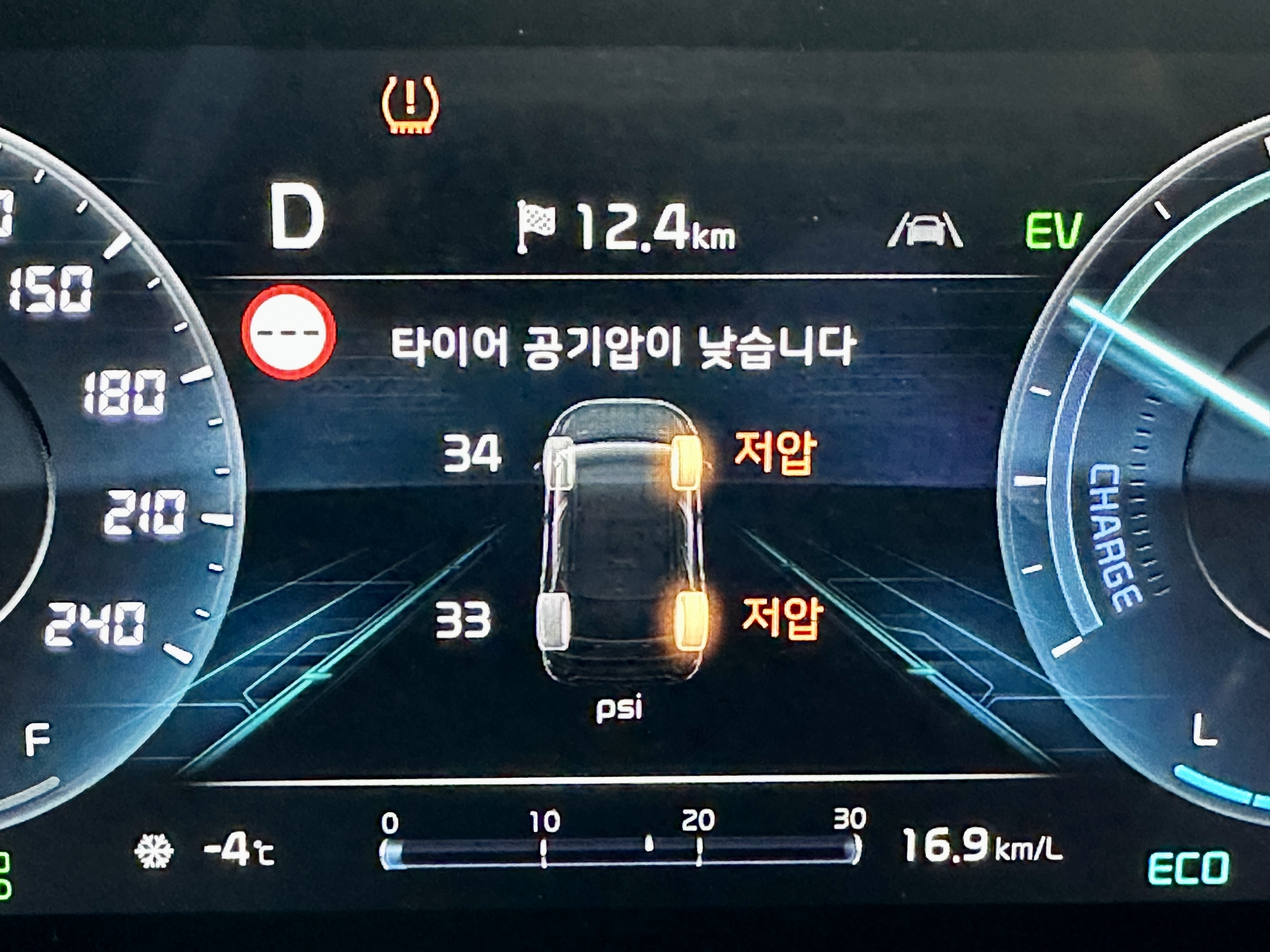 그래서 우선 금요일 저녁 퇴근길에 천천히 주행하여 집까지 온 후, 토요일 낮에 차를 다시 타보기로 했는데 역시나 계속해서 타이어 공기압이 부족하다는 경고등이 나오고 있었습니다.