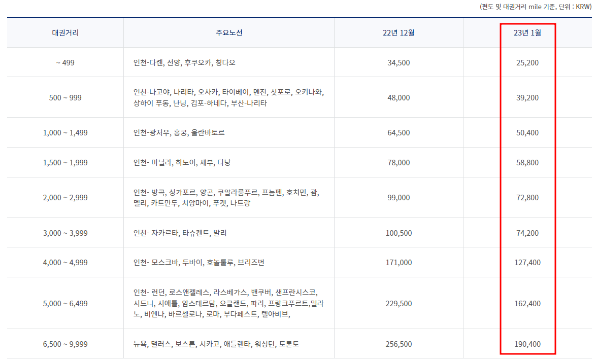 ~ 499 인천-다롄, 선양, 후쿠오카, 칭다오 34,500 25,200 500 ~ 999 인천-나고야, 나리타, 오사카, 타이베이, 톈진, 삿포로, 오키나와, 상하이 푸동, 난닝, 김포-하네다, 부산-나리타 48,000 39,200 1,000 ~ 1,499 인
