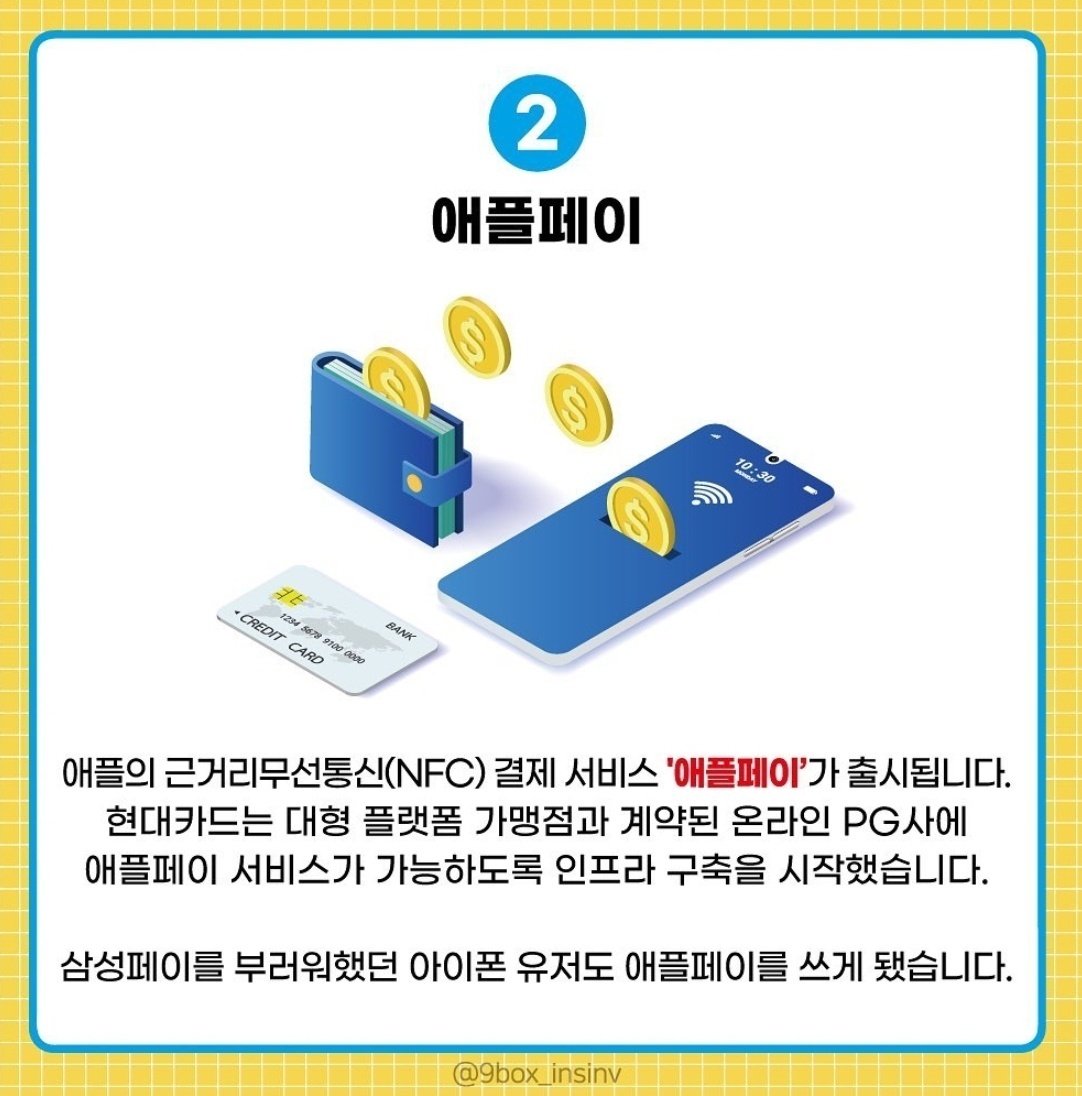 NFC 방식의 애플페이는 현대카드와 제휴하여 애플페이가 국내에서도 가능하게 된다고 합니다.