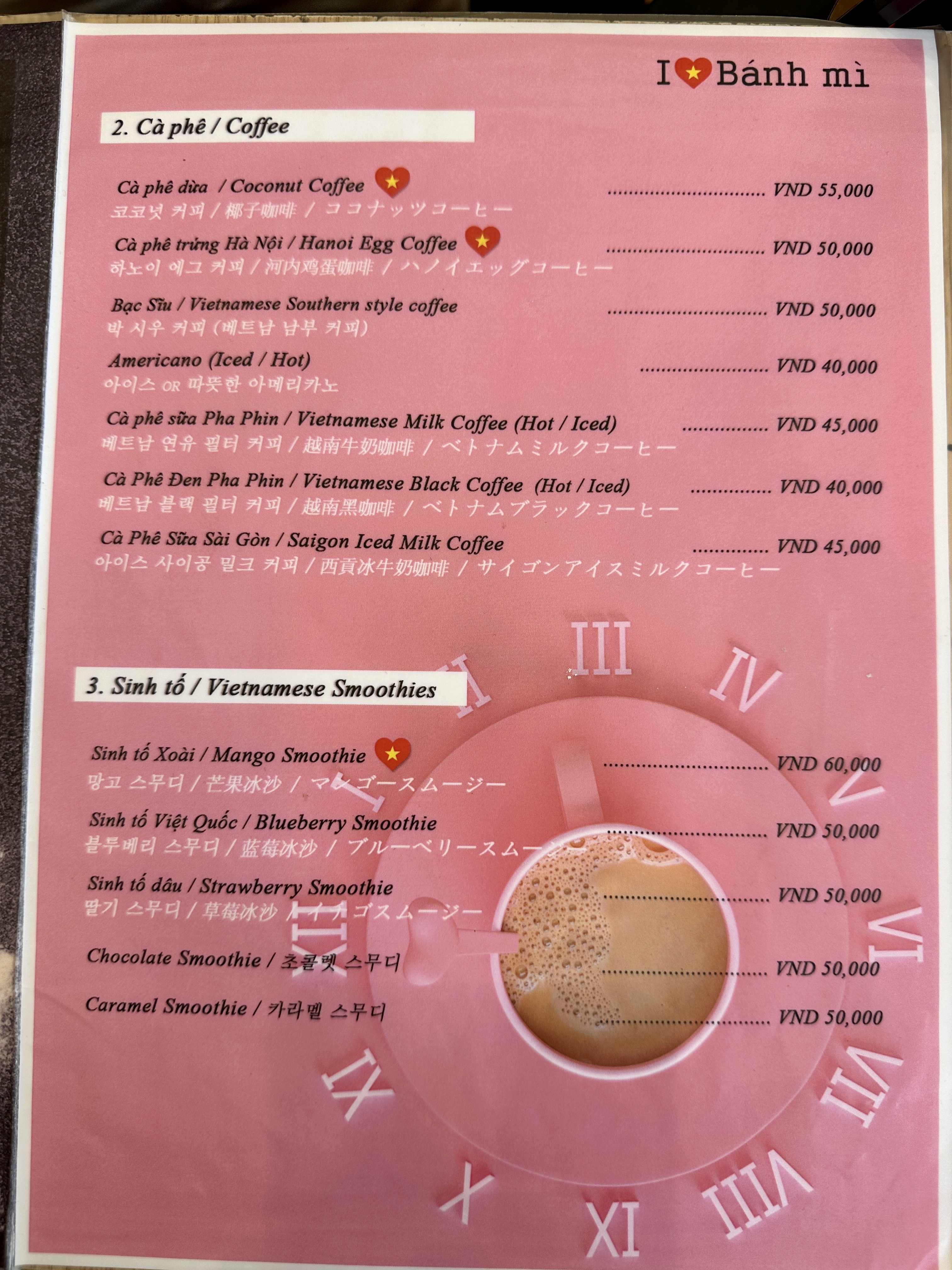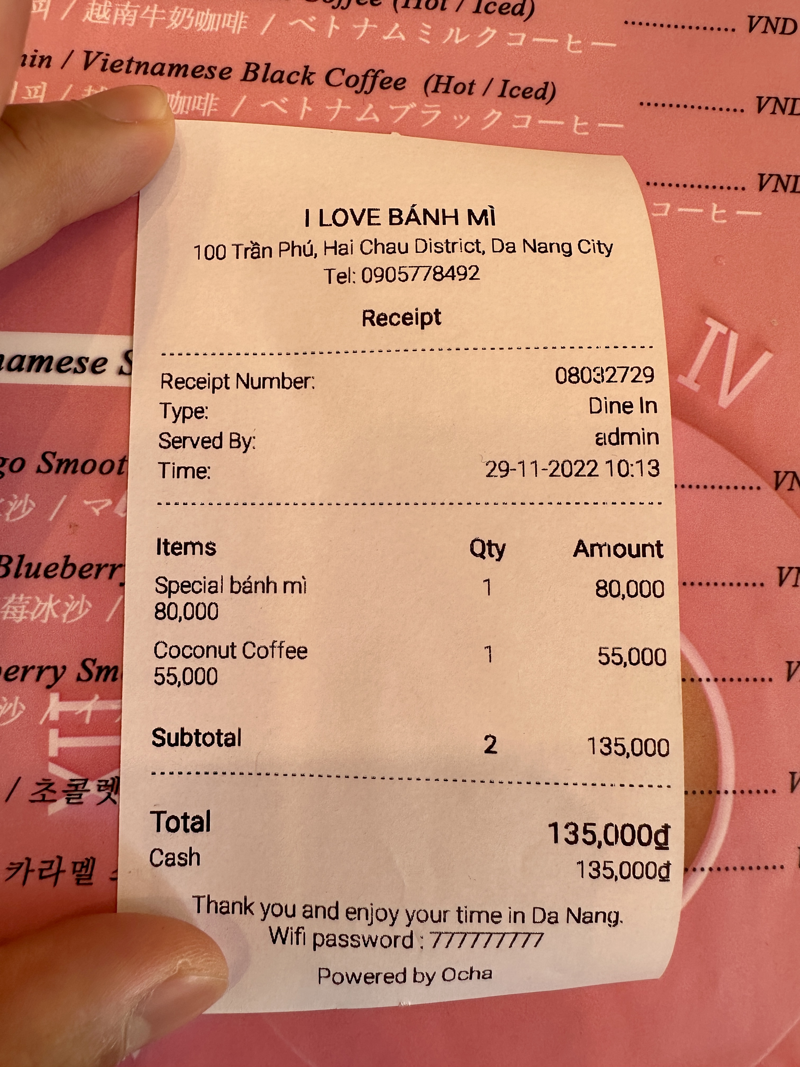 스페셜 반미와 코코넛 커피를 주문하니 135,000돟 (약 6,750원) 이 나왔습니다.