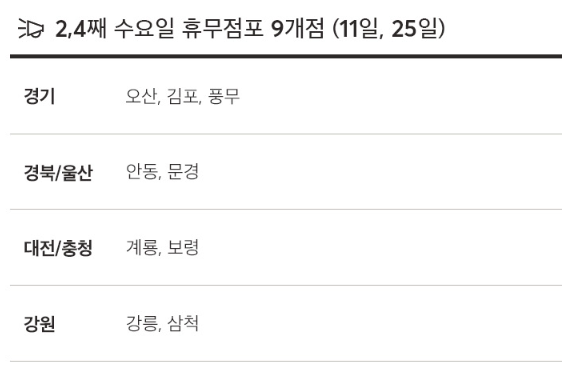두번째로 2,4째주 수요일인 1월 11일과 1월 25일에도 9개의 홈플러스점포가 휴무하게 됩니다.