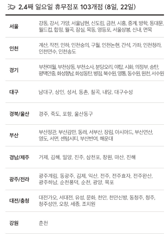 전국 대다수인 103개의 홈플러스 점포가 1월 2,4째 일요일인 1월 8일과 1월 22일에 휴무를 실시하게 됩니다.