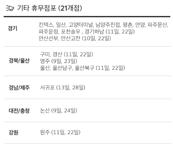 •11일, 22일 휴무 : 킨텍스, 일산, 고양터미널, 남양주진접, 평촌, 안양, 파주문산, 파주운정,