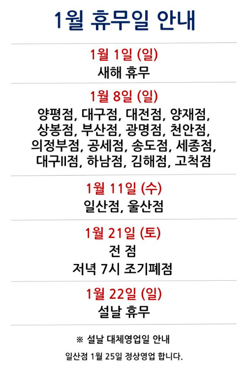 2) 1월 8일 (일) 휴무 코스트코 점포 : 코스트코 양평점, 코스트코 대구점, 코스트코 대전점,
