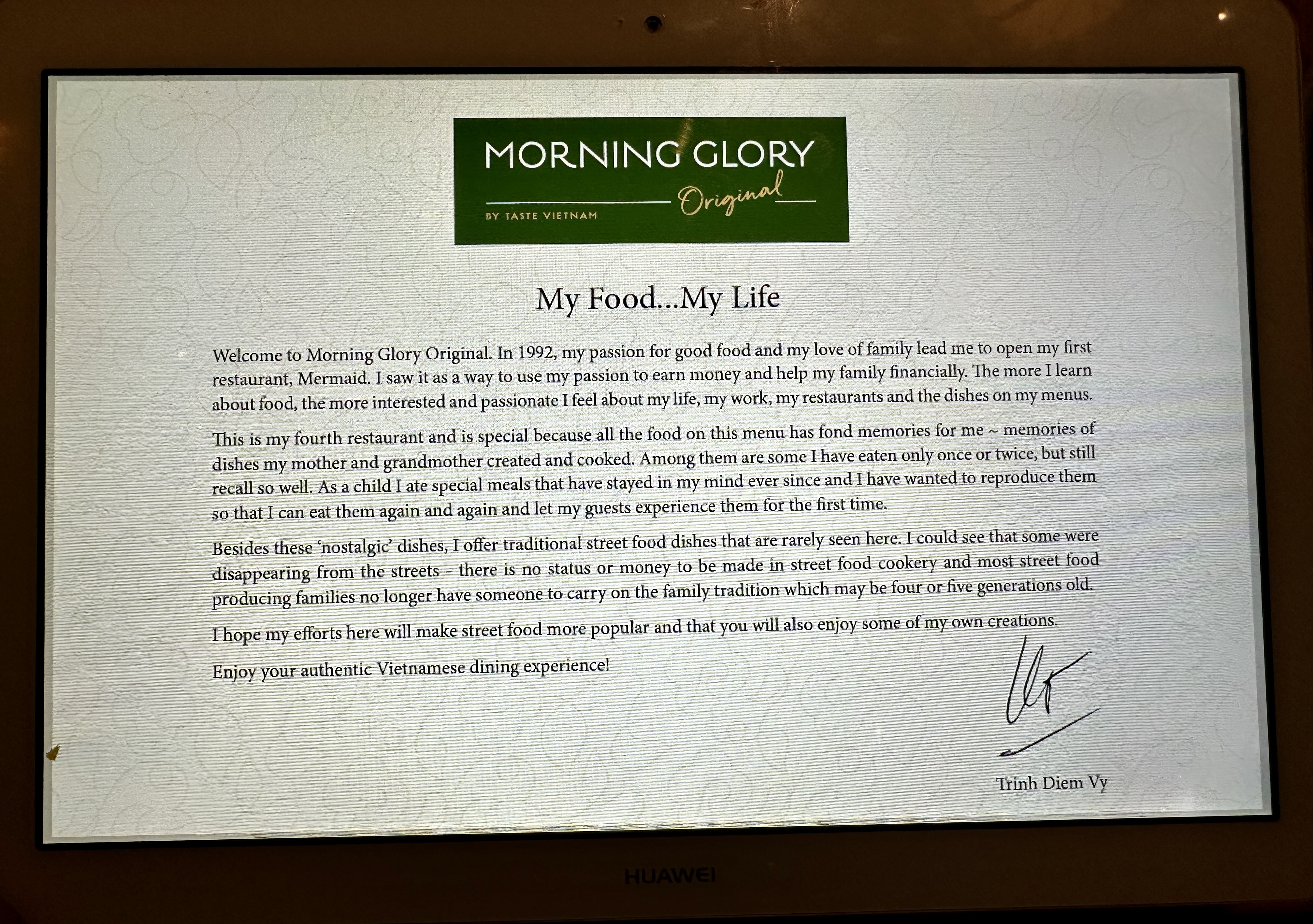 모닝글로리 메뉴판에는 대표이자 대표셰프인 Ms. Vy 의 인사와 철학이 담겨 있습니다.