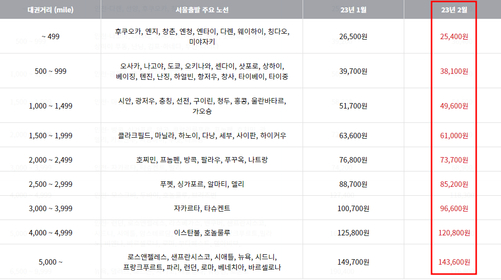 2023년 2월 대한항공 국제선 유류할증료 정보