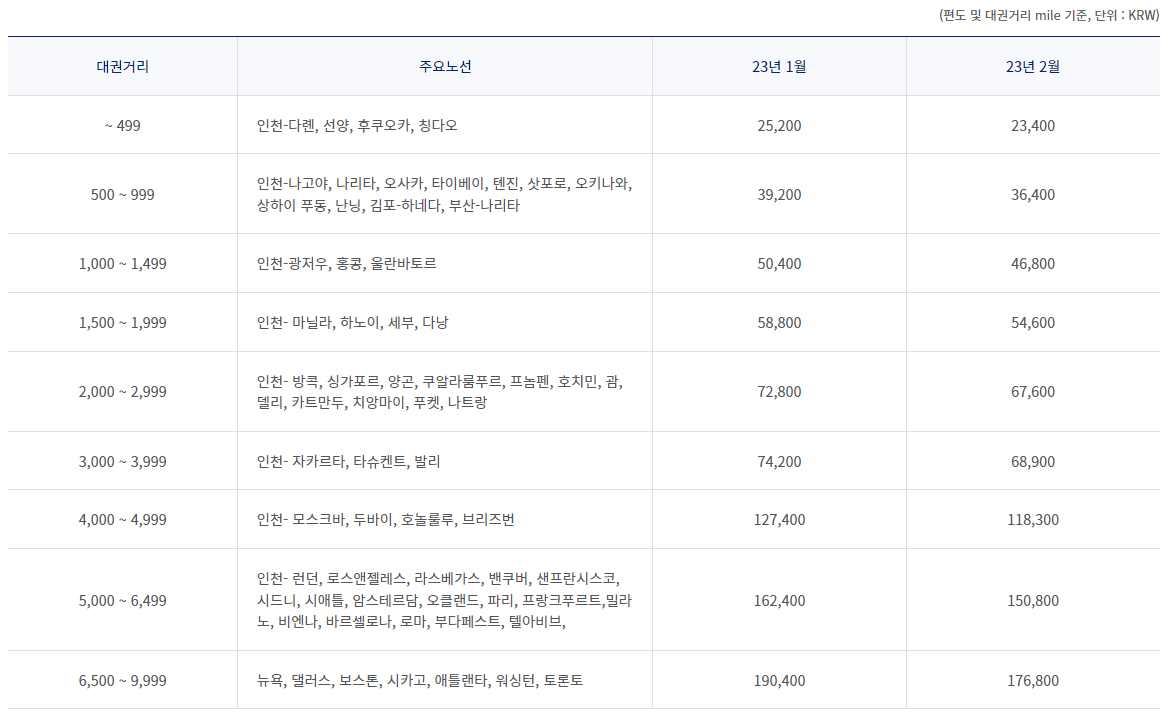 2023년 2월 대한항공 국제선 유류할증료 정보