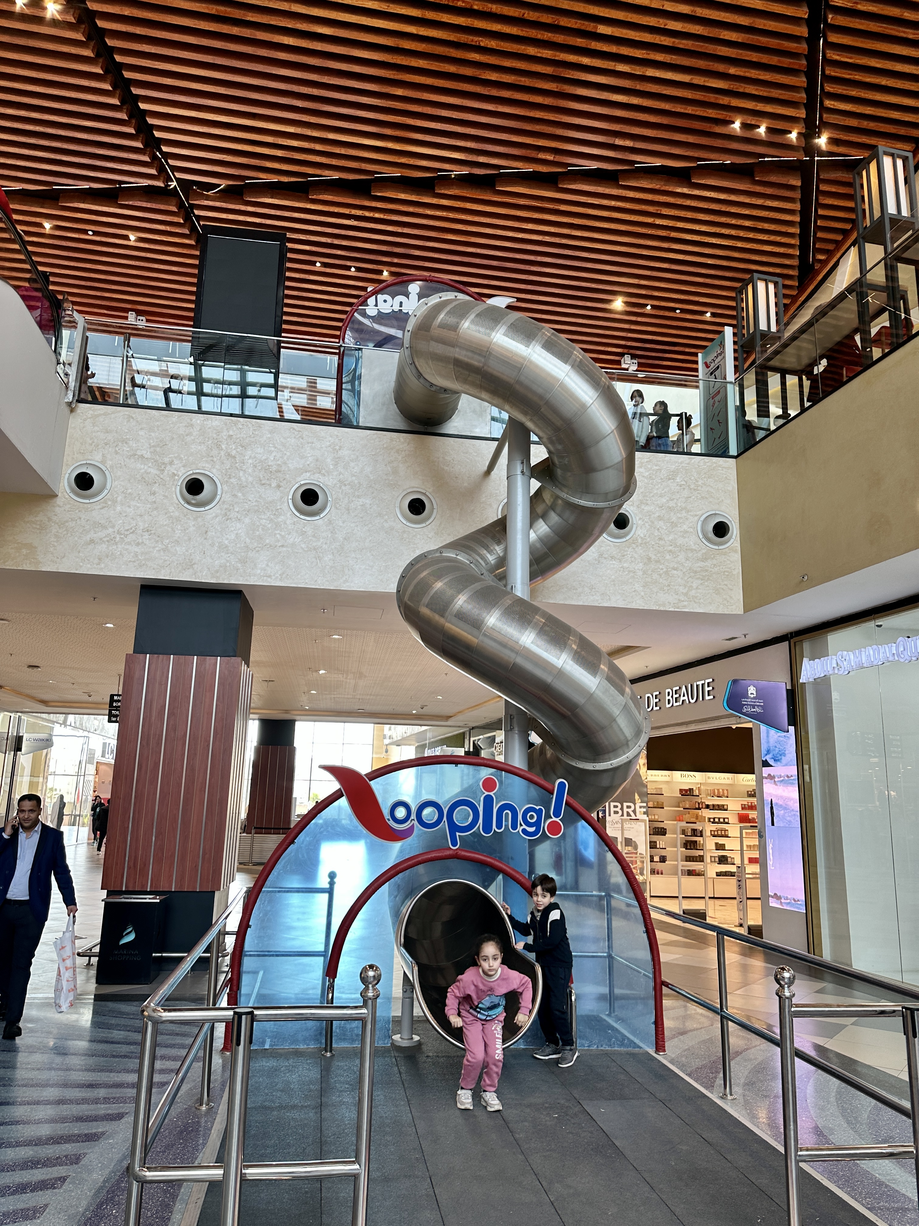 가운데에 2층에서 내려오는 미끄럼틀이 있어서 아이들이 신나게 미끄럼틀을 타고 있었습니다.