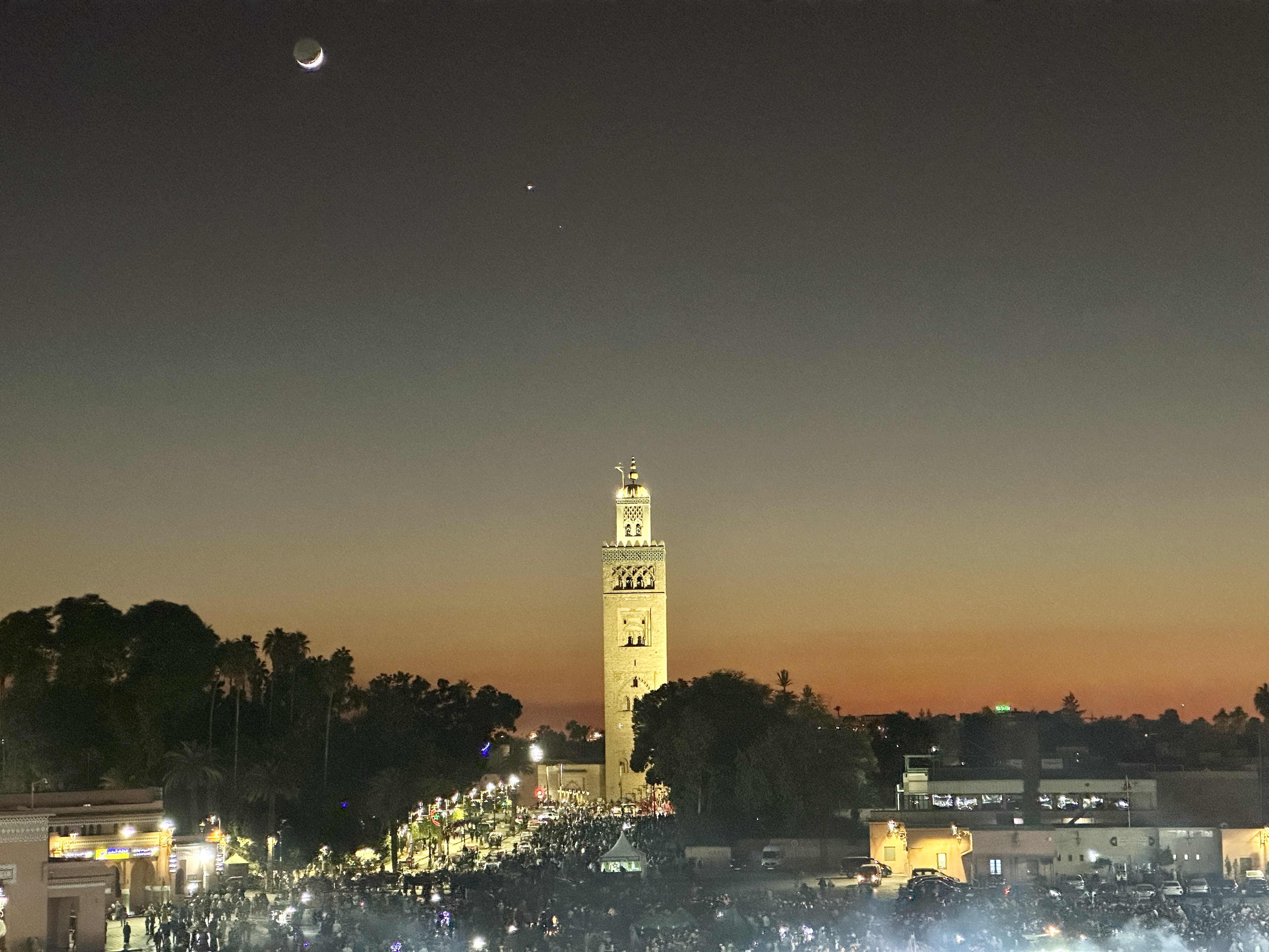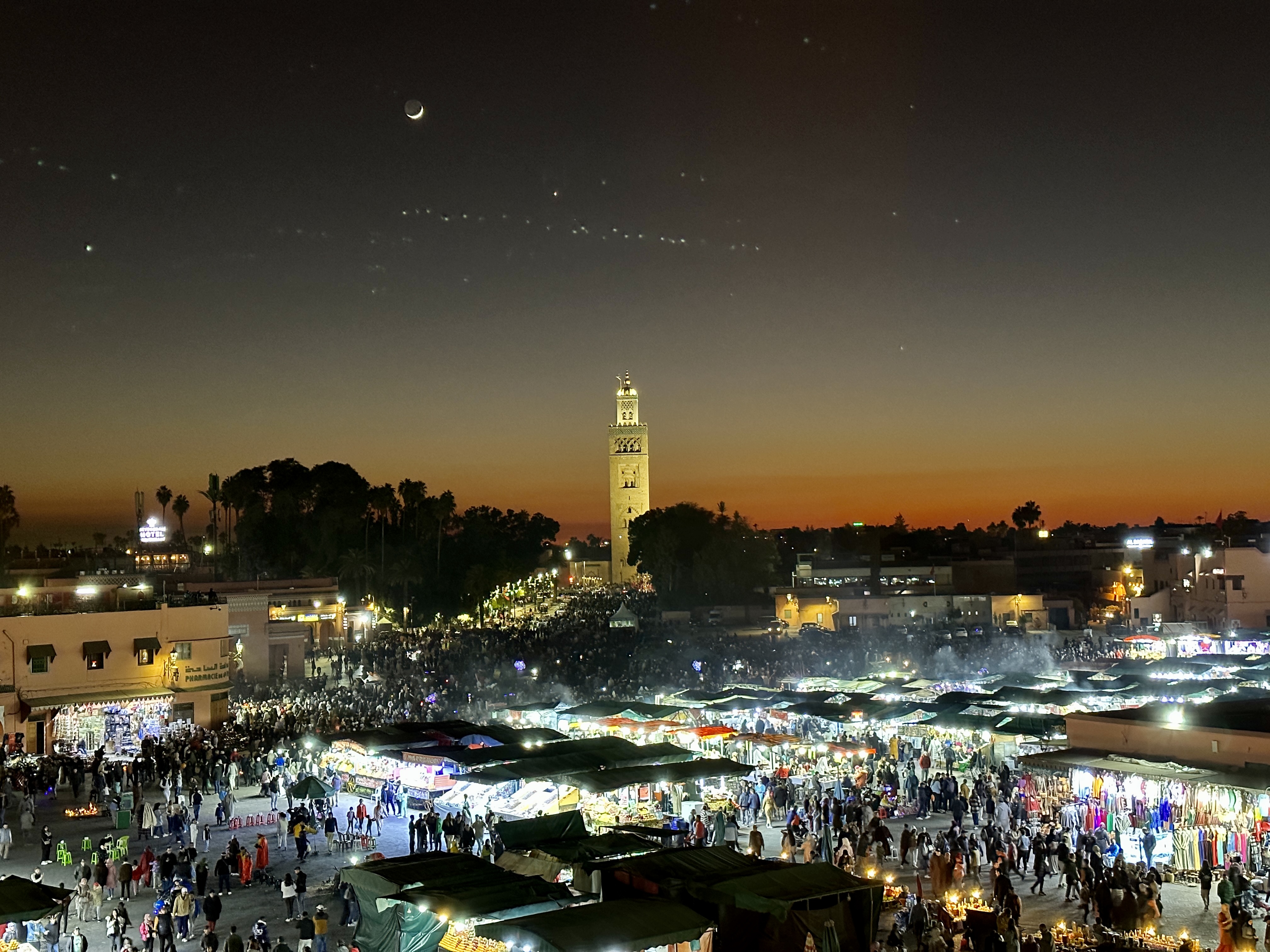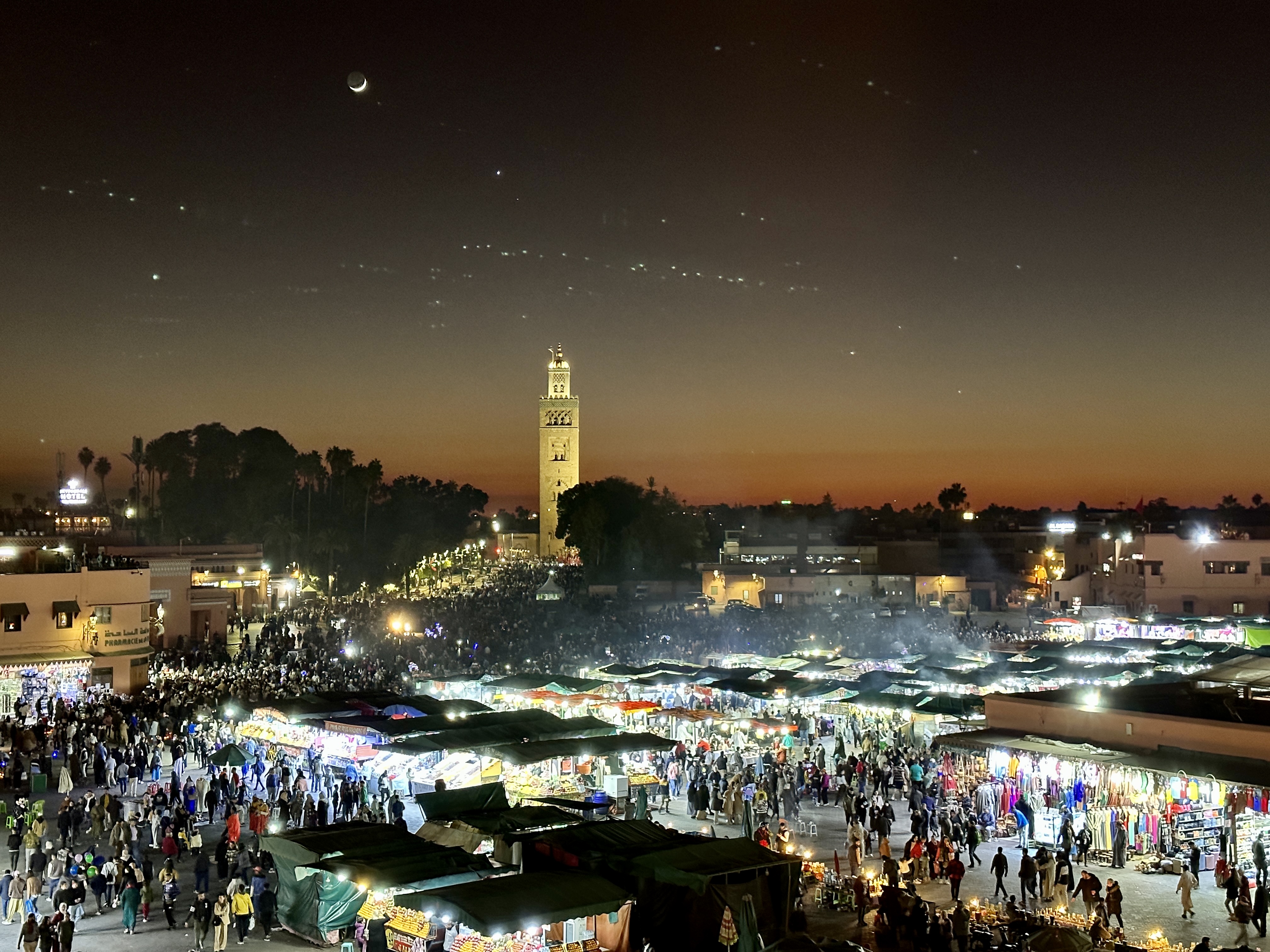 주변에 밝은 빛이 없어서 더욱 아름답고 달과 별도 잘 보이는 모로코 마라케시의 야경은