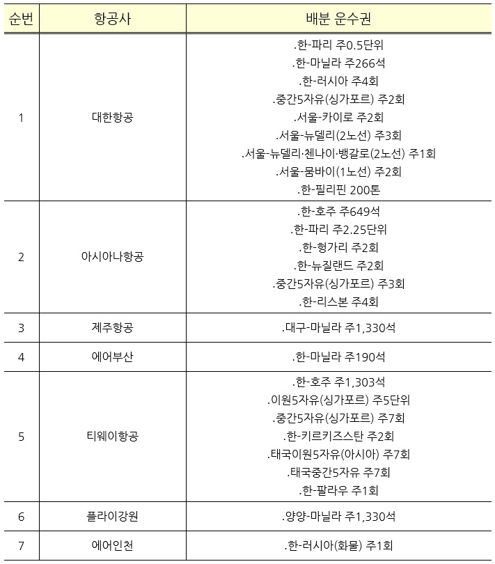 7개 국적 항공사에 배분(전체 21개 노선)했다.