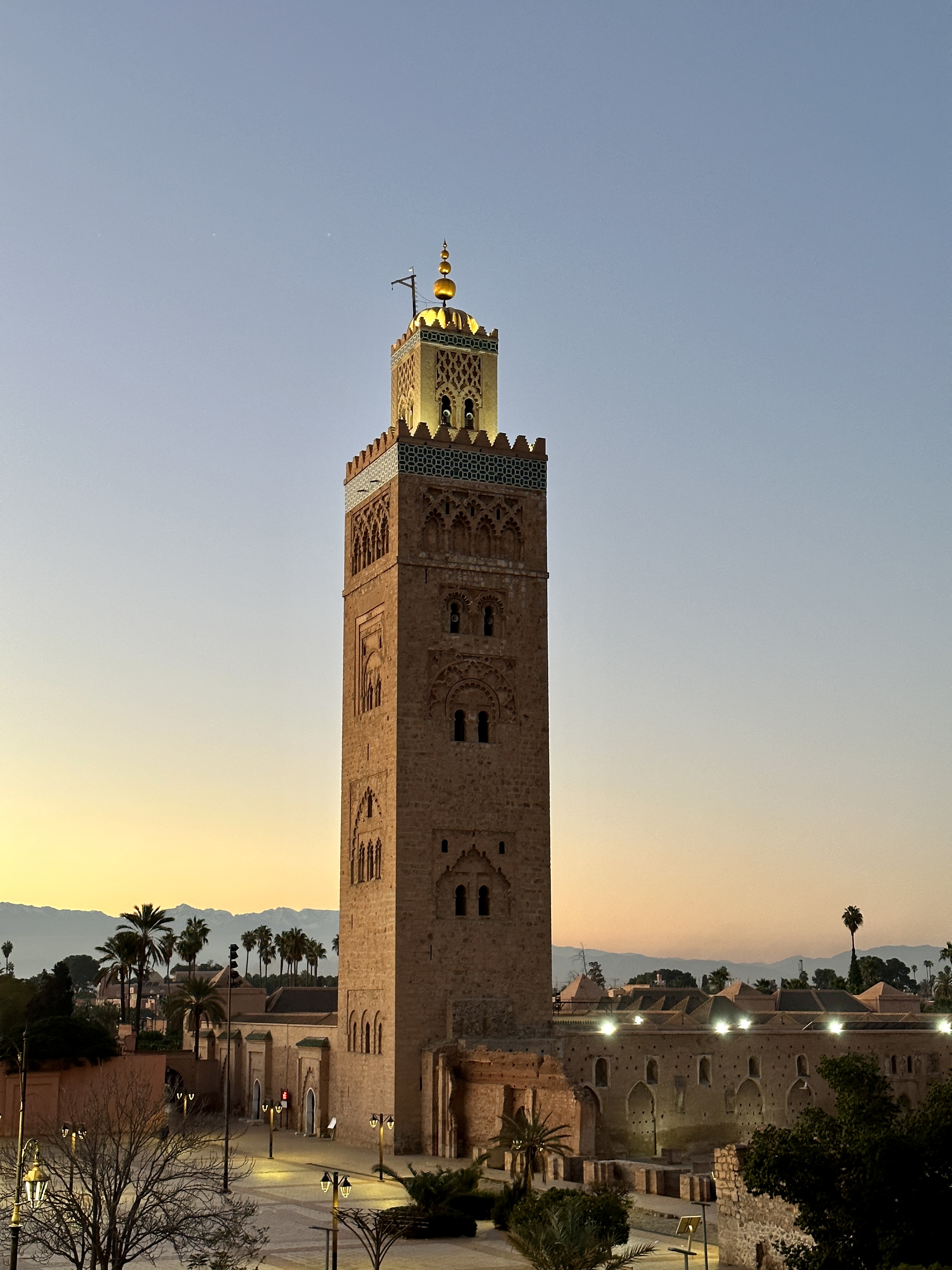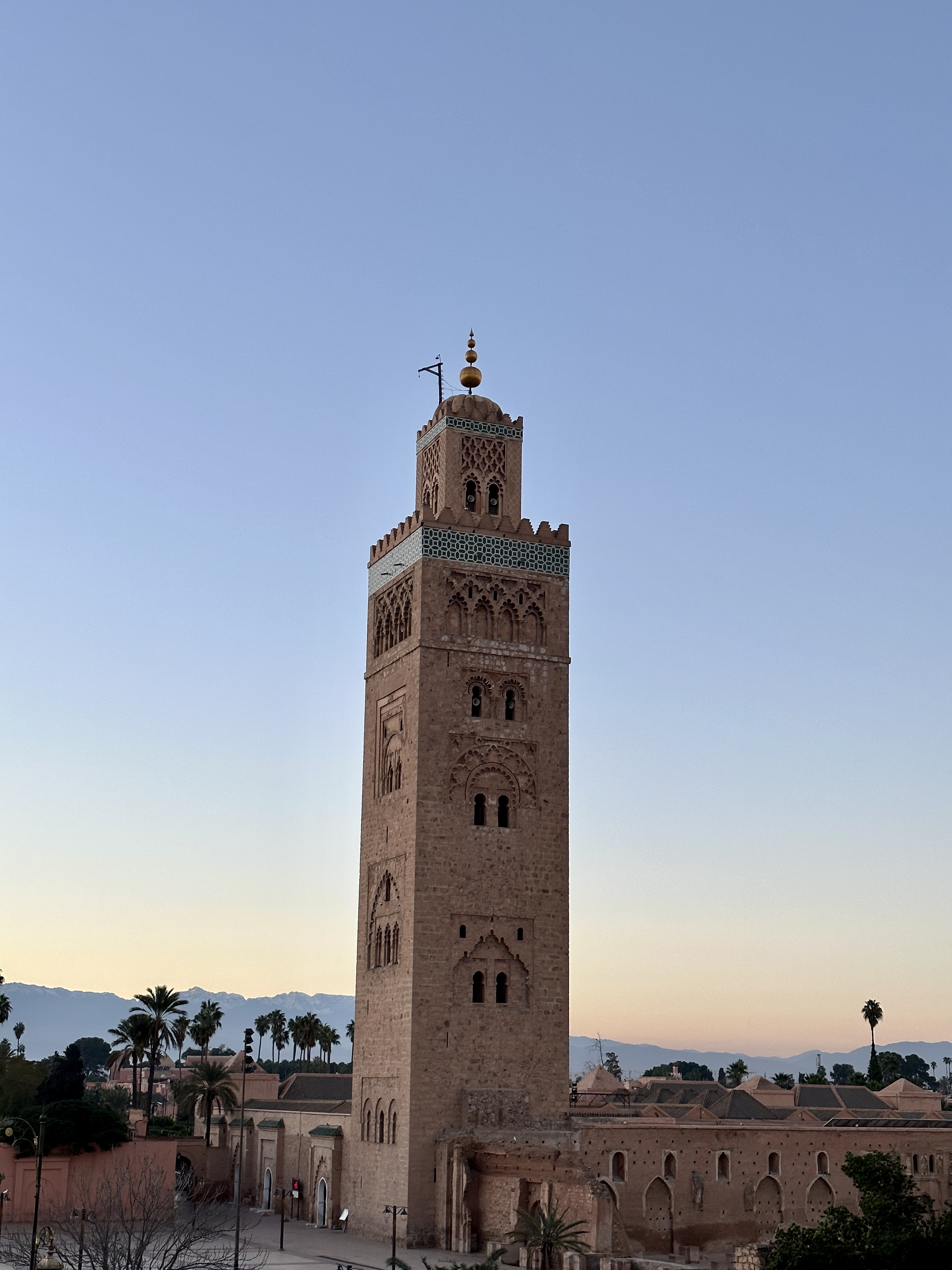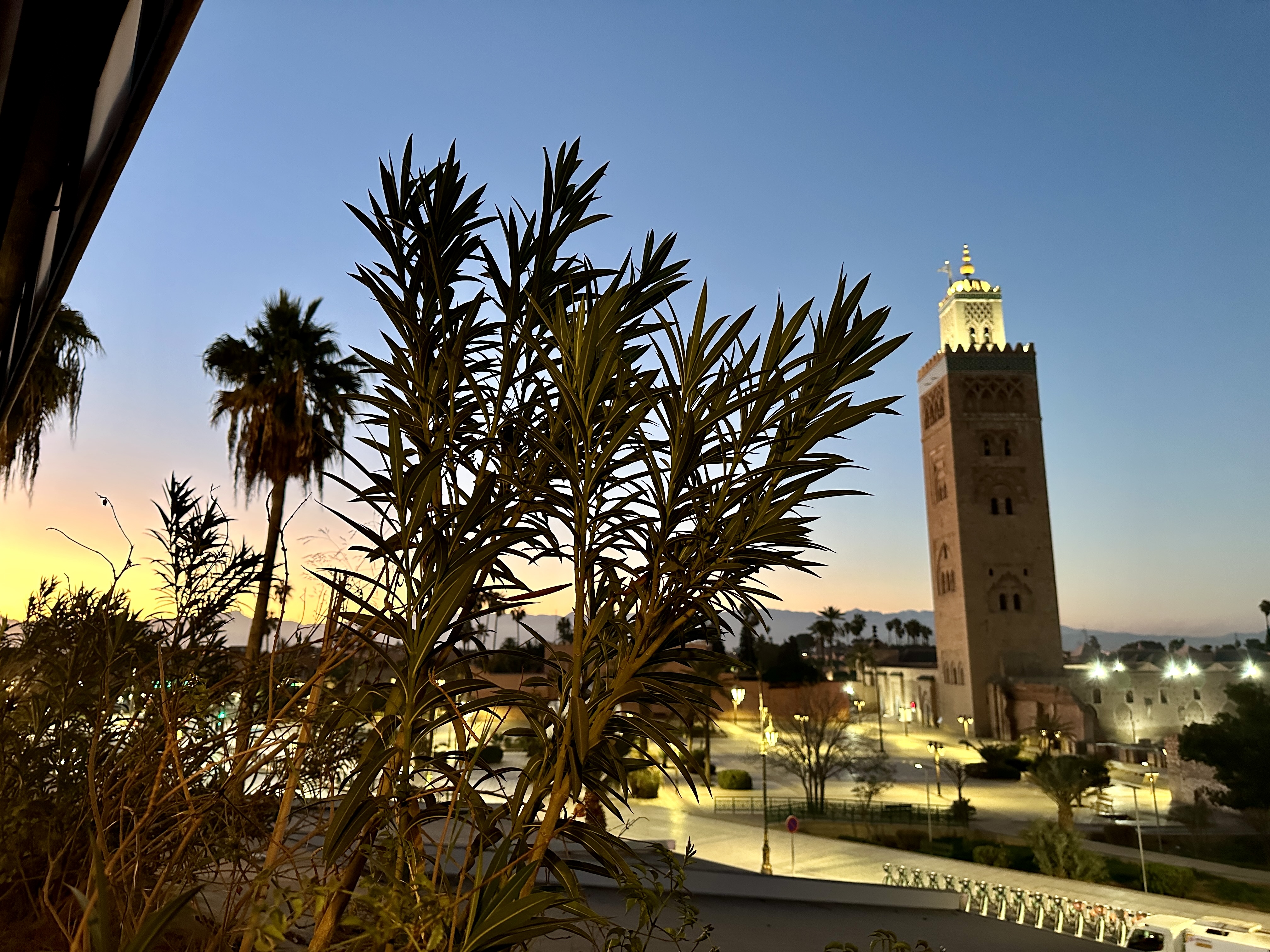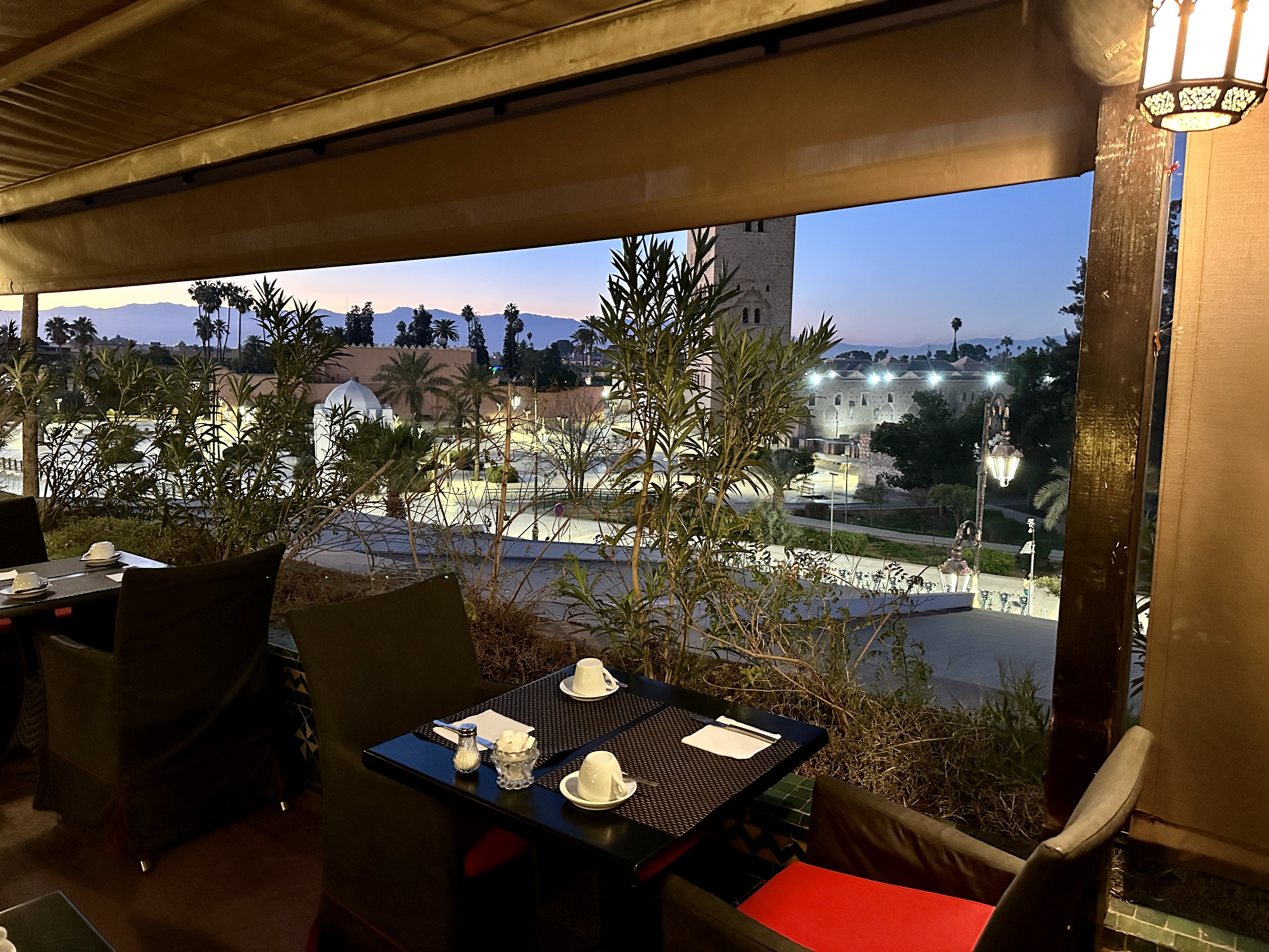 쿠투비아 모스크와 멀리 아틀라스 산맥을 배경으로 일출을 보며 조식을 즐길 수 있는 호텔 이슬란입니다.