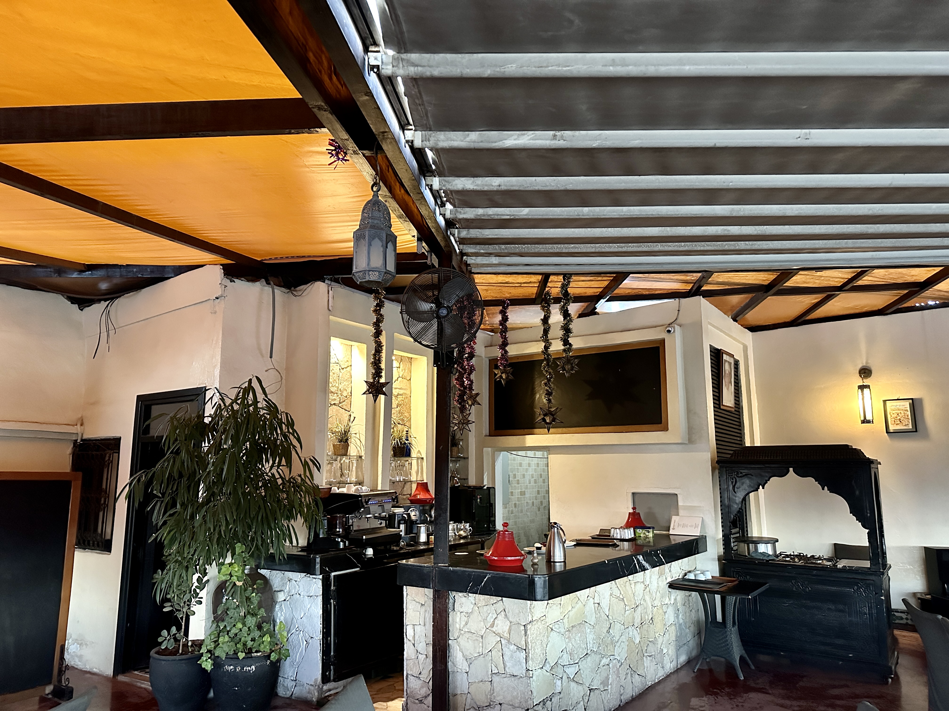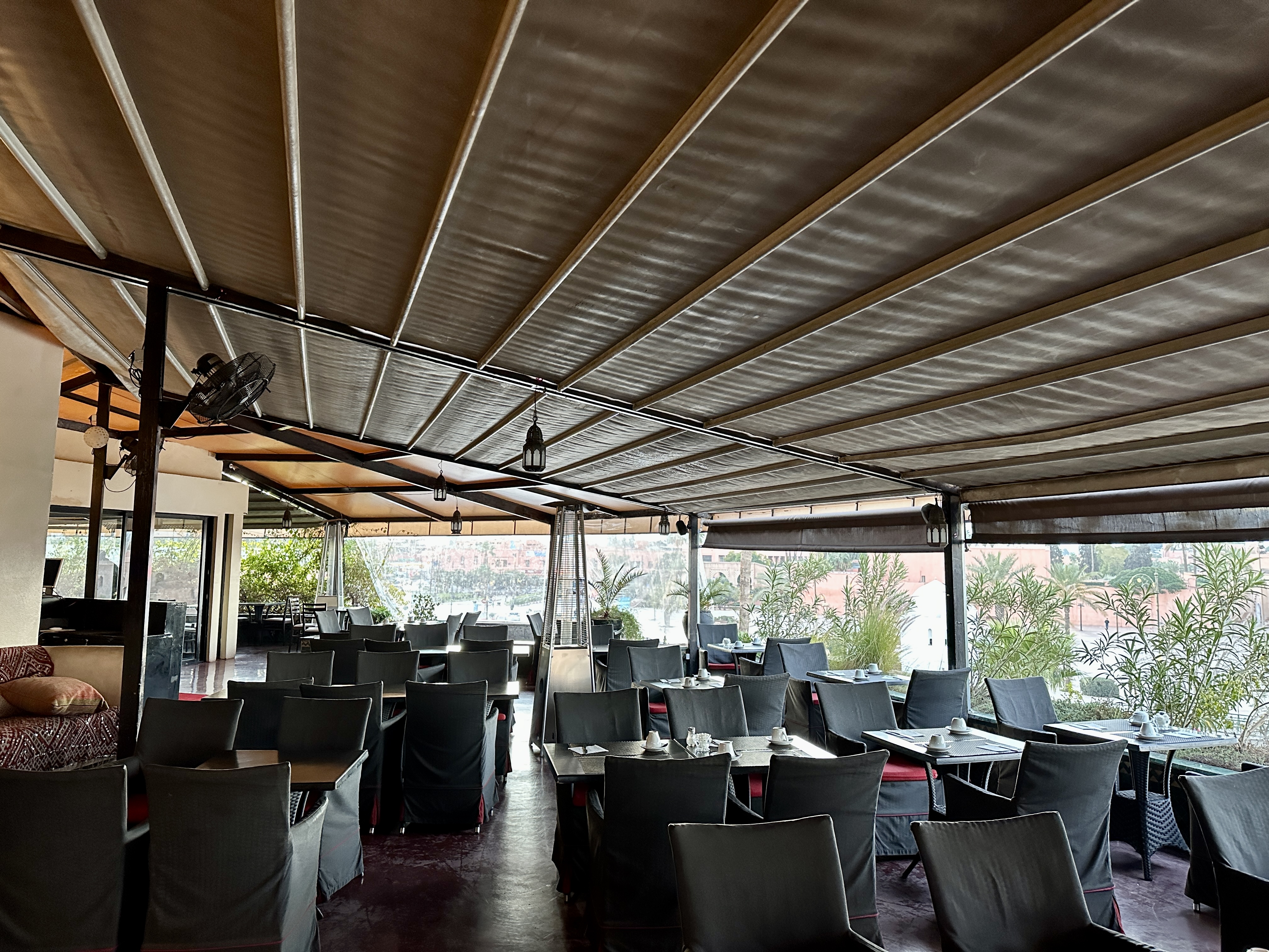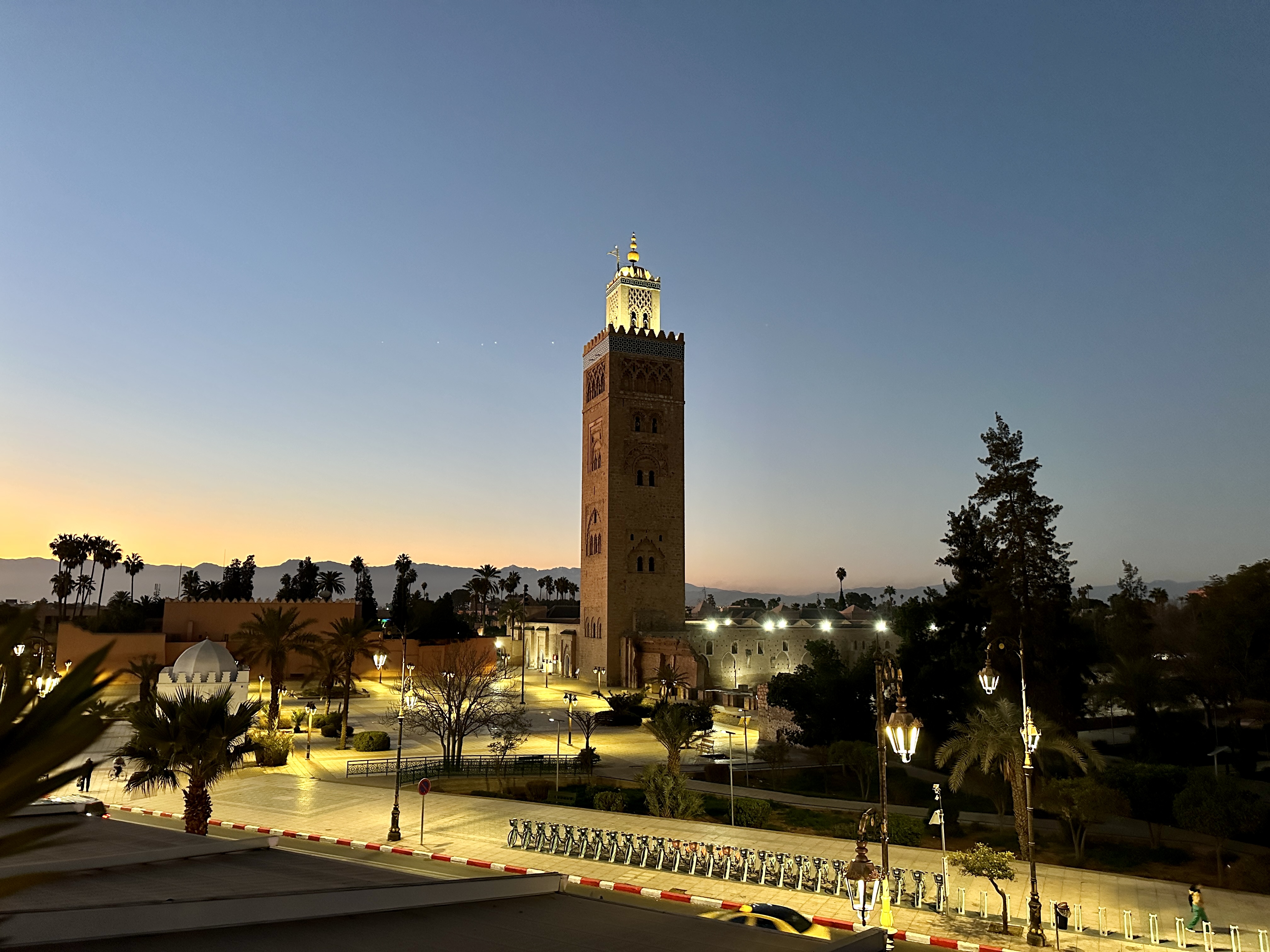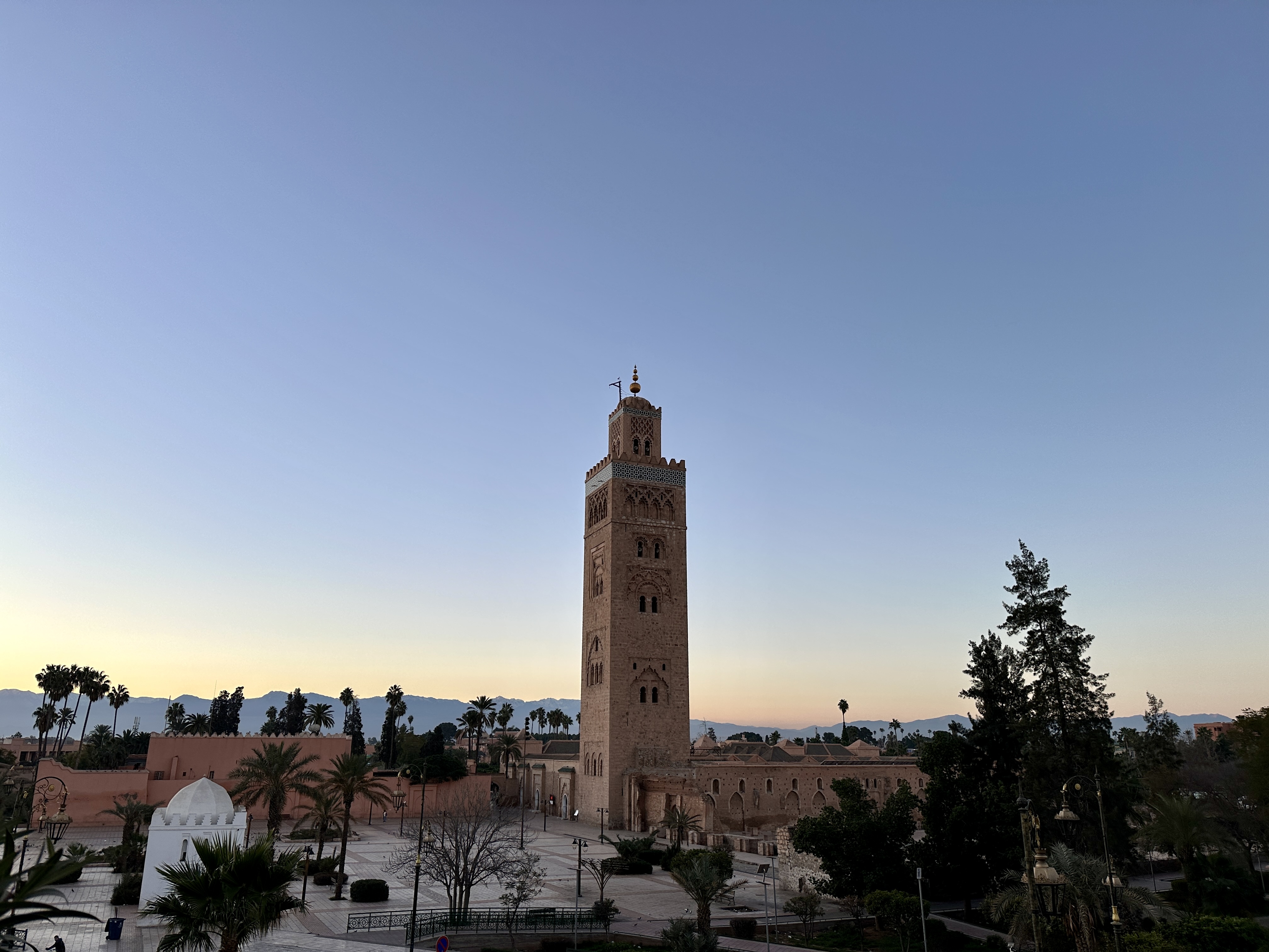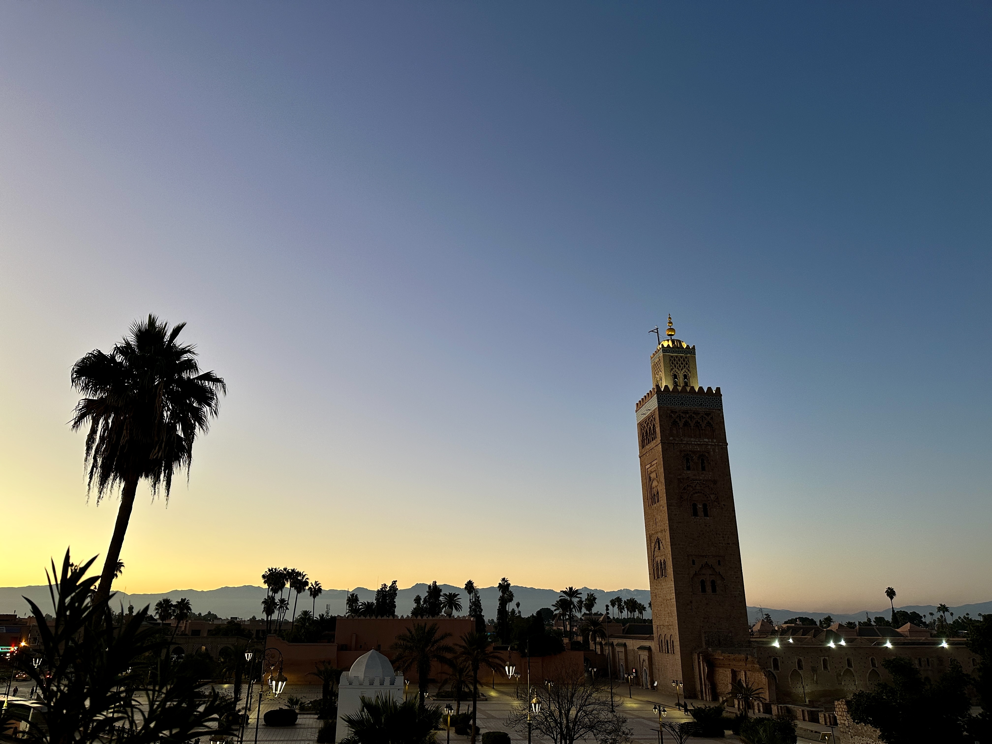 쿠투비아 모스크와 멀리 아틀라스 산맥을 배경으로 일출을 보며 조식을 즐길 수 있는 호텔 이슬란입니다.