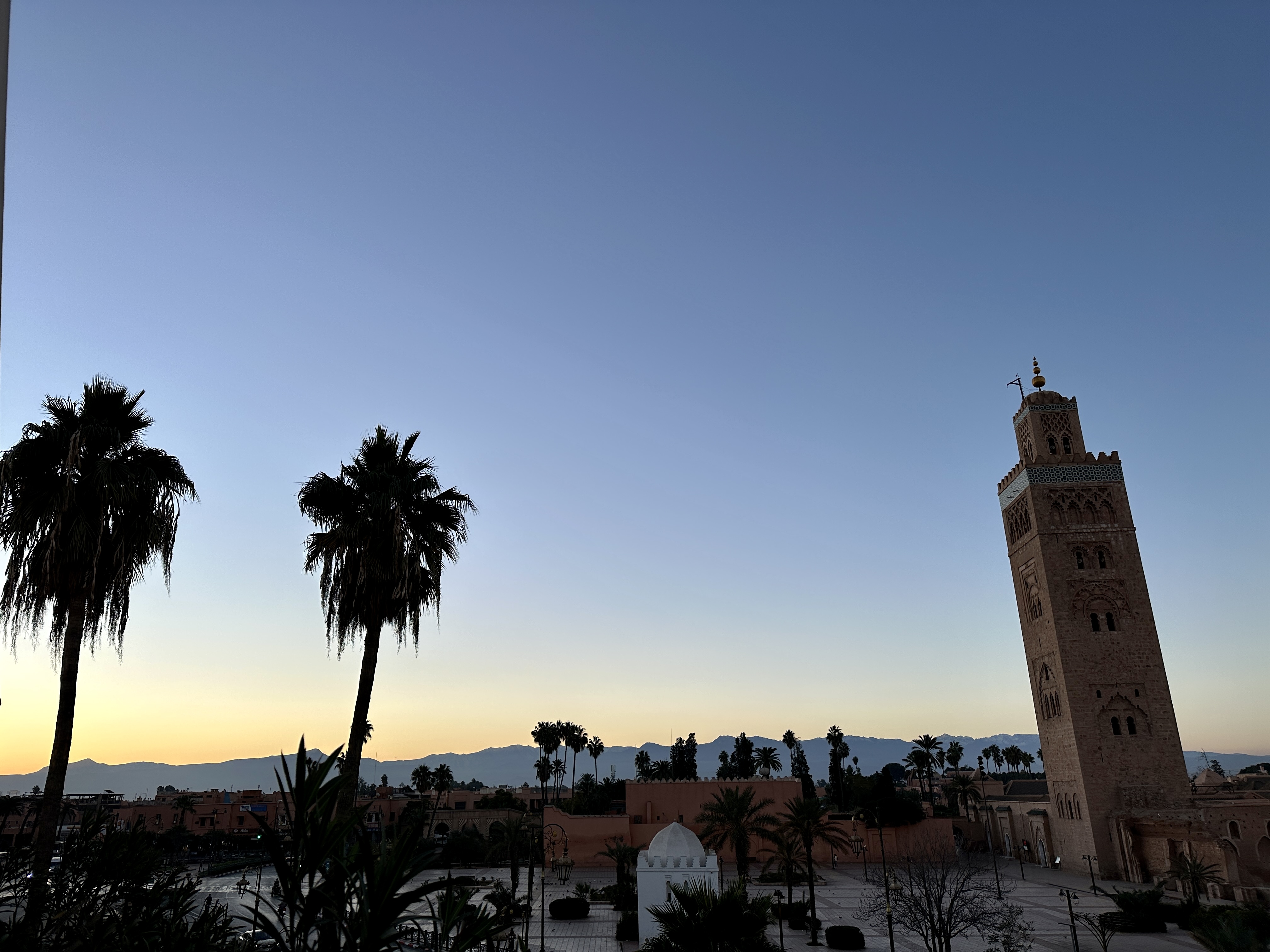 쿠투비아 모스크와 멀리 아틀라스 산맥을 배경으로 일출을 보며 조식을 즐길 수 있는 호텔 이슬란입니다.