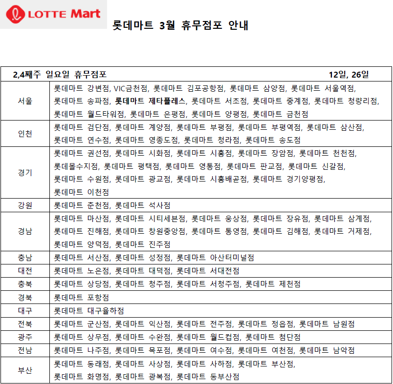 3월 롯데마트 휴무일 - 2,4째주 수요일