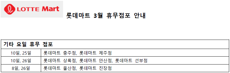 대부분의 롯데마트 점포는 2,4째주 일요일인 3월 12일과 3월 26일에 휴무합니다.